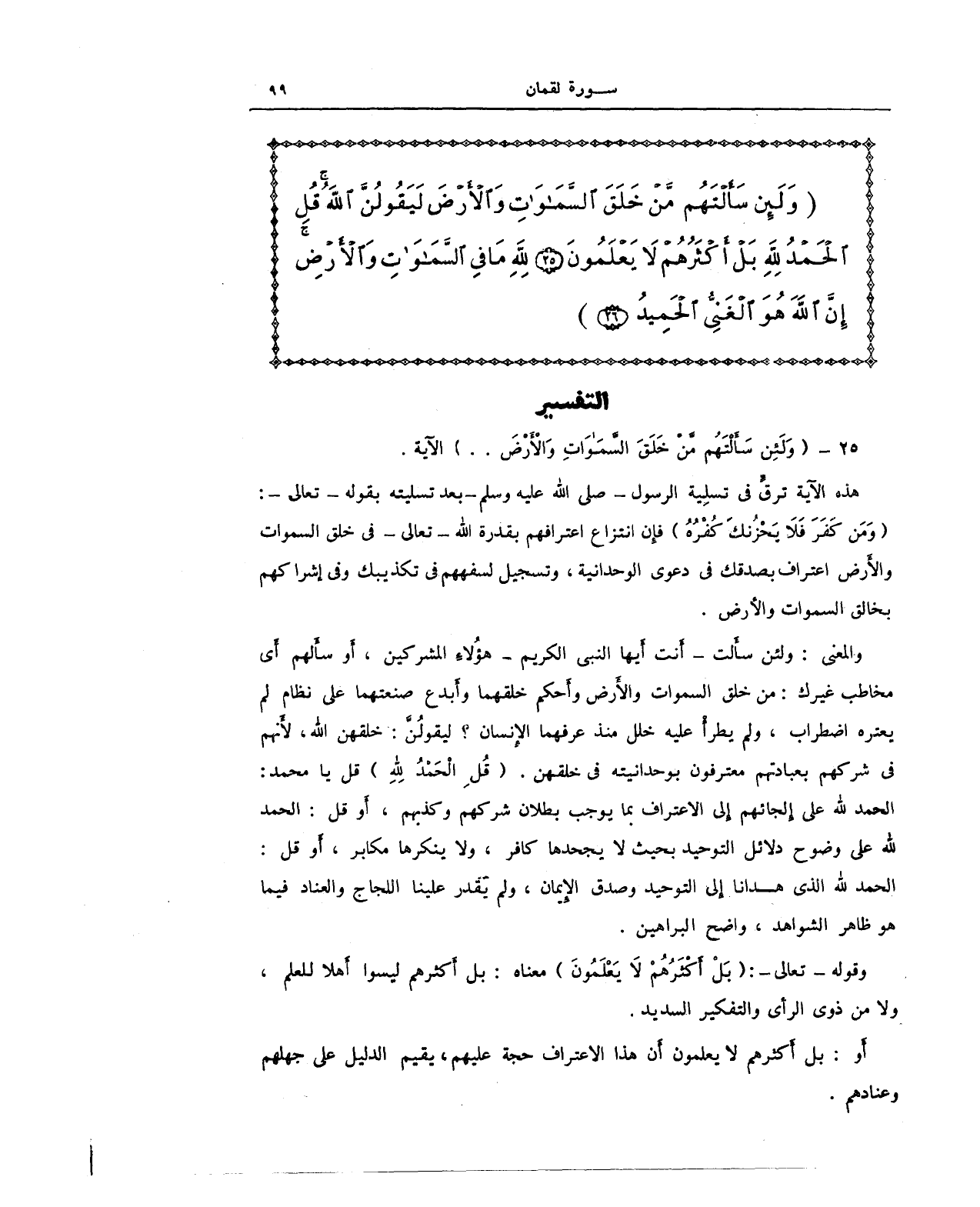 25 - {وَلَئِنْ سَأَلْتَهُمْ مَنْ خَلَقَ السَّمَاوَاتِ وَالْأَرْضَ .. } الآية.