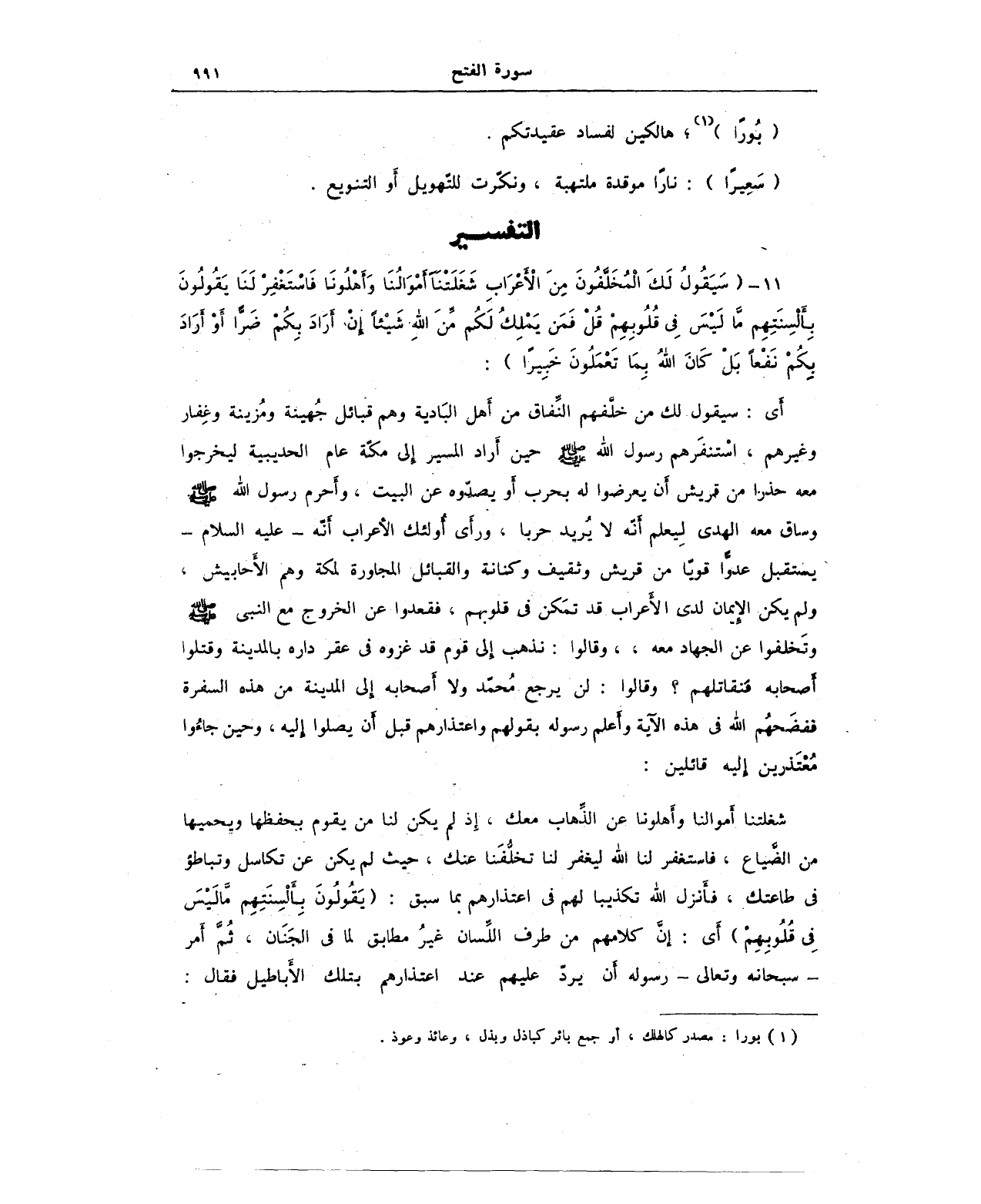 أي: سيقول لك من خلّفهم النِّفاق من أهل البادية وهم قبائل جُهينة ومُزينة وغِفار وغيرهم، استنفَرهم رسول الله - صلى الله عليه وسلم - حين أراد المسير إلى مكّة عام الحديبية ليخرجوا معه حذرا من قريش أن يعرضوا له بحرب أو يصدّوه عن البيت، وأحرم رسول الله - صلى الله عليه وسلم - وساق معه الهدي ليعلم أنه لا يريد حربا، ورأى أولئك الأعراب أنه - عليه السلام - يستقبل عدوا قويا من قريش وثقيف وكنانة والقبائل المجاورة لمكة وهم الأحابيش، ولم يكن الإيمان لدى الأعراب قد تمكن في قلوبهم، فقعدوا عن الخروج مع النبي - صلى الله عليه وسلم - وتخلفوا عن الجهاد معه، وقالوا: نذهب إلى قوم قد غزوه في عقر داره بالمدينة وقتلوا أصحابه فنقاتلهم؟ وقالوا: لن يرجع مُحمد ولا أصحابه إلى المدينة من هذه السفرة ففضَحهُم الله في هذه الآية وأعلم رسوله بقولهم واعتذارهم قبل أن يصلوا إليه، وحين جاءوا معتذرين إليه قائلين: