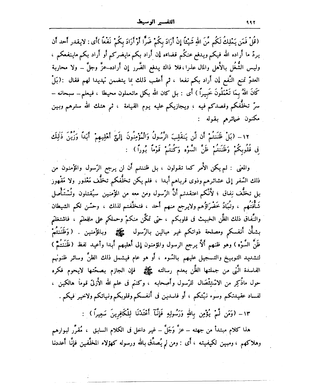والمعنى: لم يكن الأمر كما تقولون، بل ظننتم أن لن يرجع الرسول والمؤمنون من ذلك السّفر إلى عشائرهم وذوى قرباهم أبدا، فلم يكن تخلفكم تخلف معذور ولا مقهور بلى تخلُّف نفاق؛ لأنَّكم اعتقدتم أنَّ الرسول ومن معه من المؤمنين سيقتلون وتُستأصل شأفتهم، وتُبَادُ خضراؤهم ولا يرجع منهم أحد، فتخلفتم لذلك، وحسّن لكم الشيطان والنفاق ذلك الظن الخبيث في قلوبكم، حتى تمكَّن منكم وحملكم على ما فعلتم، فاشتغلتم بشأن أنفسكم ومصلحة ذواتكم غير مبالين بالرسول - صلى الله عليه وسلم - وبالمؤمنين. {وَظَنَنْتُمْ ظَنَّ السَّوْءِ} وهو ظنهم ألاَّ يرجع الرسول والمؤمنون إلى أهليهم أبدا وأعيد لفظ {ظَنَنْتُمْ} لتشديد التوبيخ والتسجيل عليهم بالسّوء، أو هو عام فيشمل ذلك الظنَّ وسائر ظنونهم الفاسدة التي من جملتها الظّن بعدم رسالته - صلى الله عليه وسلم - فإن الجازم بصحتها لا يحوم فكره حول ما ذُكِر من الاستئصال للرسول وأصحابه، وكنتم في علم الله الأزليّ قومًا هالكين، لفساد عقيدتكم وسوء نيّتكم، أو فاسدين في أنفسكم وقلوبكم ونياتكم ولا خير فيكم.