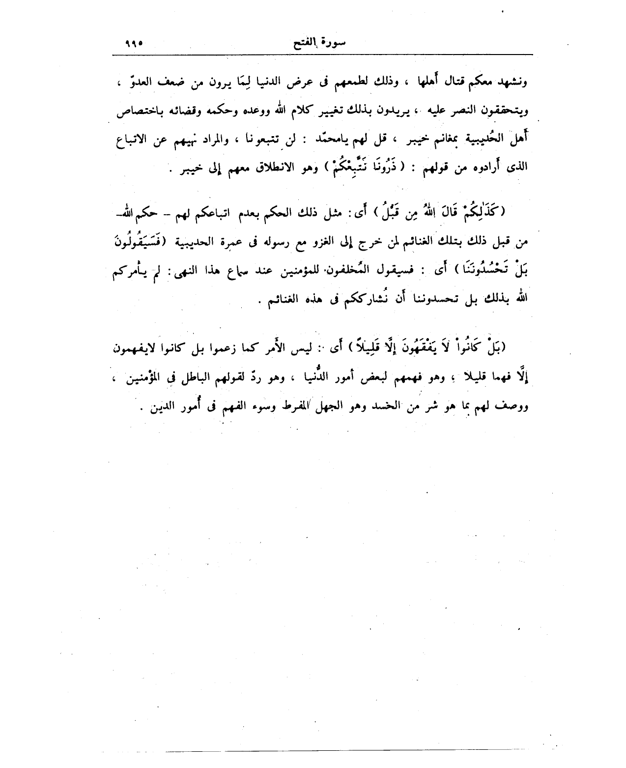 {بَلْ كَانُوا لَا يَفْقَهُونَ إِلَّا قَلِيلًا} أي: ليس الأمر كما زعموا بل كانوا لا يفهمون إلا فهما قليلًا، وهو فهمهم لبعض أمور الدُّنيا، وهو ردّ لقولهم الباطل في المؤمنين، ووصف لهم بما هو شر من الحسد وهو الجهل المفرط وسوء الفهم في أمور الدين.