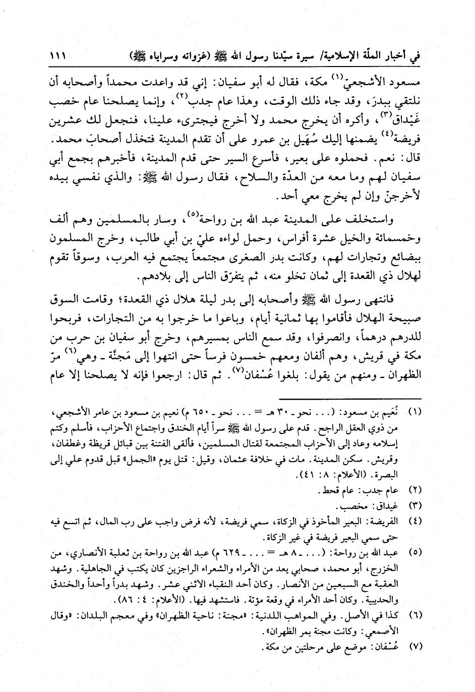 مسعود الأشجعى مكة ، فقال له أبو سفيان : إني قد واعدت محمدا وأصحابه أن نلتقى ببدر ، وقد جاء ذلك الوقت ، وهذا عام جدب ، وإنما يصلحنا عام خصب غيداق ، وأكره أن يخرج محمد ولا أخرج فيجترئ علينا ، فنجعل لك عشرين فريضة يضمنها إليك سهيل بن عمرو على أن تقدم المدينة فتخذل أصحاب محمد . قال : نعم .