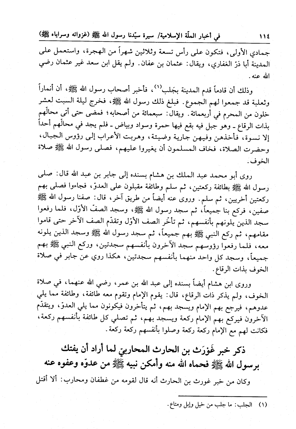 روى أبو محمد عبد الملك بن هشام بسنده إلى جابر بن عبد الله ، قال : صلى رسول الله ( صلى الله عليه وسلم ) بطائفة ركعتين ، ثم سلم ، وطائفة مقبلون على العدو ، فجاءوا فصلى بهم ركعتين أخريين ، ثم سلم . وروى عنه أيضا من طريق آخر ، قال : صفنا رسول الله ( صلى الله عليه وسلم ) صفين ، فركع بنا جميعا ، ثم سجد رسول الله ( صلى الله عليه وسلم ) ، وسجد الصف الأول ، فلما رفعوا سجد الذين يلونهم بأنفسهم ، ثم تأخر الصف الأول وتقدم الصف الآخر حتى قاموا مقامهم ، ثم ركع النبى ( صلى الله عليه وسلم ) بهم جميعا ، ثم سجد رسول الله ( صلى الله عليه وسلم ) وسجد الذين يلونه معه ، فلما رفعوا رءوسهم سجد الآخرون بأنفسهم سجدتين ، وركع النبى ( صلى الله عليه وسلم ) بهم جميعا ، وسجد كل واحد منهما بأنفسهم سجدتين . هكذا روى عن جابر في الصلاة الخوف بذات الرقاع . وروى ابن هشام أيضا بسنده إلى عبد الله بن عمر ، رضى الله عنهما ، في الصلاة الخوف ، ولم يذكر ذات الرقاع ، قال : يقوم الإمام ونقوم معه طائفة ، وطائفة مما يلى عدوهم ، فيركع بهم الإمام ويسجد بهم ، ثم يتأخرون فيكونون مما بلى العدو ، ويتقدم الآخرون فيركع بهم الإمام ركعة ويسجد بهم ، ثم تصلى كل طائفة بأنفسهم ركعة ، لهم مع الإمام ركعة ركعة وصلوا بأنفسهم ركعة ركعة .