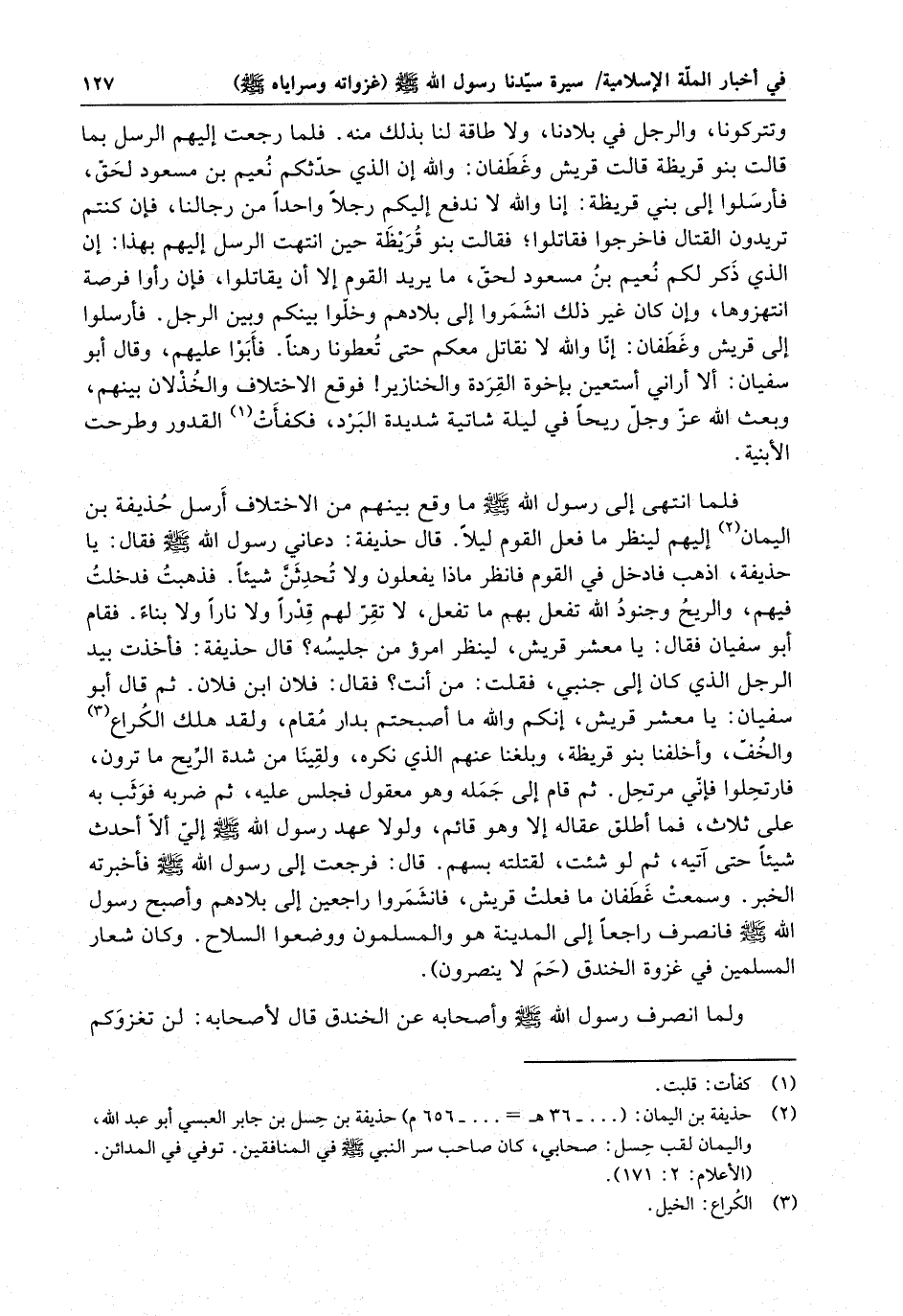 وتتركونا ، والرجل في بلادنا ، ولا طاقة لنا بذلك منه . فلما رجعت إليهم الرسل بما قالت بنو قريظة قالت قريش وغطفان : والله إن الذي حدثكم نعيم بن مسعود لحق ، فأرسلوا إلى بنى قريظة : إنا والله لا ندفع إليكم رجلا واحدا من رجالنا ، فإن كنتم تريدون القتال فأخرجوا فقاتلوا ؛ فقالت بنو قريظة حين انتهت الرسل إليهم بهذا : إن الذي ذكر لكم نعيم ابن مسعود لحق ، ما يريد القوم إلا أن يقاتلوا ، فإن رأوا فرصة آنتهزوها ، وإن كان غير ذلك آنشمروا إلى بلادهم وخلوا بينكم وبين الرجل . فأرسلوا إلى قريش وغطفان : إنا والله لا نقاتل معكم حتى تعطونا رهنا . فأبوا عليهم ، وقال أبو سفيان : ألا أرانى أستعين بإخوة القردة والخنازير فوقع الآختلاف والخذلان بينهم ، وبعث الله عز وجل عليهم ريحا في ليلة شتاتية شديدة البرد ، فكفأت القدور وطرحت الأبنية . فلما آنتهى إلى رسول الله ( صلى الله عليه وسلم ) ما وقع بينهم من الاختلاف أرسل حذيقة بن اليمان إليهم لينظر ما فعل القوم ليلا . قال حذيقة : دعانى رسول الله ( صلى الله عليه وسلم ) فقال : يا حذيقة ، اذهب فادخل في القوم فانظر ماذا يفعلون ولا تحدثن شيئا . فذهب فدخلت فيهم ، والريح وجنود الله تفعل بهم ما تفعل ، لا تقر لهم قدرا ولا نارا ولا بناء . فقام أبو سفيان فقال : يا معشر قريش ، لينظر آمرؤ من جليسه ؟ قال حذيقة : فأخذت بيد الرجل الذي كان إلى جنبى ، فقلت : من أنت ؟ فقال : فلان ابن فلان . ثم قال أبو سفيان : يا معشر قريش ، إنكم والله ما أصبحتم بدار مقام ، ولقد هلك الكراع والخف ، وأخلفنا بنو قريظة ، وبلغنا عنهم الذي نكره ، ولقينا من شدة الريح ما ترون ، فآرتحلوا فإني مرتحل . ثم قام إلى جمله وهو معقول فجلس عليه ، ثم ضربه فوثب به على ثلاث ، فما أطلق عقاله إلا وهو قائم ، ولولا عهد رسول الله ( صلى الله عليه وسلم ) إلى ألا أحدث شيئا حتى آتيه ، ثم لو شئت ، لقتلته بسهم . قال : فرجعت إلى رسول الله ( صلى الله عليه وسلم ) فأخبرته الخبر . وسمعت غطفان ما فعلت قريش ، فانشمروا راجعين إلى بلادهم وأصبح رسول الله ( صلى الله عليه وسلم ) فانصرف راجعا إلى المدينة والمسلمون ووضعوا السلاح . وكان شعار المسلمين في غزوة الخندق حم لاينصرفون .