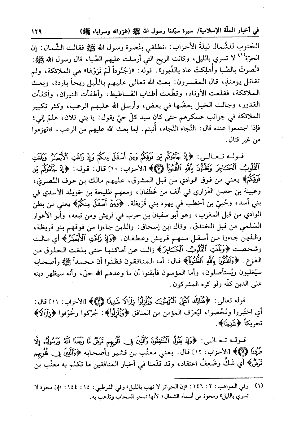 الجنوب للشمال ليلة الأحزاب : انطلقى بنصرة رسول الله ( صلى الله عليه وسلم ) فقالت الشمال : إن الحرة لا تسرى بالليل ؛ وكانت الريح التى أرسلت عليهم الصبا ، قال رسول الله - ( صلى الله عليه وسلم ) - : " نصرت بالصبا وأهلكت عاد بالدبور . " قوله : " وجنودا لم تروها " هي الملائكة ، ولم تقاتل يومئذ ، قال المفسرون : بعث الله تعالى عليهم بالليل ريحا باردة ، وبعث الملائكة فقلعت الأوتاد ، وقطعت أطناب الفساطيط ، وأطفأت النيران ، وأكفأت القدور ، وجالت الخيل بعضها في بعض ، وأرسل الله عليهم الرعب ، وكثر تكبير الملائكة في جوانب عسكرهم حتى كان سيد كل حي يقول : يا بنى فلان ، هلم إلى ؛ فإذا اجتمعوا عنده قال : النجاء النجاء ، أتيتم . لما بعث الله عليهم من الرعب ، فانهزموا من غير قتال . قوله تعالى : " إذ جاءوكم من فوقكم ومن أسفل منكم وإذ زاغت الأبصار وبلغت القلوب الحناجر وتظنون بالله الظنونا " قال : قوله : " إذ جاءوكم من فوقكم " يعنى من فوق الوادي من قبل المشرق ، عليهم مالك بن عوف النصرى ، وعيينة آبن حصن الفزارى في ألف من غطفان ، ومعهم طليحة بن خويلد الأسدي في بنى أسد ، وحي بن أخطب في يهود بنى قريظة . ومن أسفل منكم يعني من بطن الوادي من قبل المغرب ، وهو أبو سفيان بن حرب في قريش ومن تبعه ، وأبو الأعور السلمى من قبل الخندق . وقال ابن إسحاق : الذين جاءوا من فوقهم بنو قريظة ، والذين جاءوا من أسفل منهم قريش وغطفان . وإذ زاغت الأبصار أي مالت وشخصت وبلغت القلوب الحناجر زالت عن أماكنها حتى بلغت الحلوق من الفزع . وتظنون بالله الظنونا قال : أما المنافقون فظنوا أن محمدا ( صلى الله عليه وسلم ) وأصحابه سيغلبون ويستأصلون ، وأما المؤمنون فأيقنوا أن ما وعدهم الله حق ، وأنه سيظهر دينه على الدين كله ولو كره المشركون .