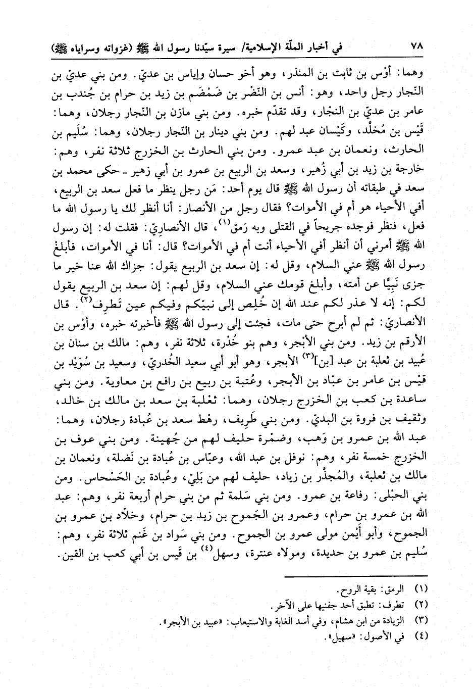 وأوس بن الأرقم بن زيد . ومن بنى الأبجر ، وهم بنو خدرة ، ثلاثة نفر ، وهم : مالك بن سنان بن عبيد بن ثعلبة بن عبد بن الأبحر ، وهو أبو أبى سعيد الخدرى ، وسعيد بن سويد بن قيس بن عامر بن عباد بن الأبجر ، وعتبة بن ربيع ابن رافع بن معاوية . ومن بنى ساعدة بن كعب بن الخزرج رجلان ، وهما : ثعلبة بن سعد بن مالك بن خالد ، وثقيف بن فروة بن البدى . ومن بنى طريف ، رهط سعد بن عبادة رجلان ، وهما : عبد الله بن عمرو بن وهب ، وضمرة حليف لهم من جهينة . ومن بنى عوف بن الخزرج خمسة نفر ، وهم : نوفل ابن عبد الله ، وعباس بن عبادة بن نضلة ، ونعمان بن مالك بن ثعلبة ، والمجذر ابن زياد ، حليف لهم من بلى ، وعبادة بن الحسحاس . ومن بنى الحبلى ، رفاعة ابن عمرو ، ومن بنى سلمة ثم من بنى حرام أربعة نفر ، وهم : عبد الله بن عمرو ابن حرام ، وعمرو بن الجموح بن زيد بن حرام ، وخلاد بن عمرو بن الجموح ، وأبو أيمن مولى عمرو بن الجموح . ومن بنى سواد بن غنم ثلاثة نفر ، وهم : سليم بن عمرو بن حديدة ، ومولاه عنترة ، وسهل بن قيس بن أبى كعب بن القين .