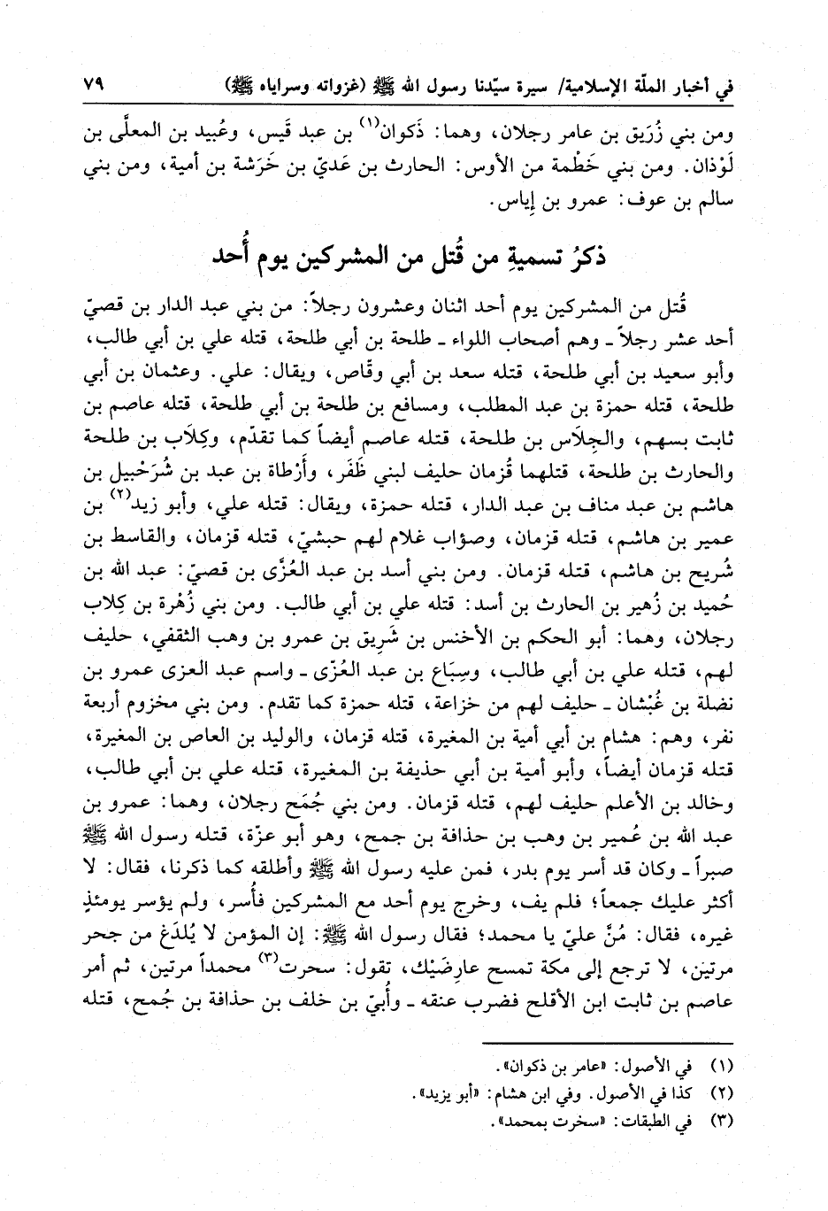 قتل من المشركين يوم أحد اثنان وعشرون رجلا : من بنى عبد الدار بن قصى أحد عشر رجلا - وهم أصحاب اللواء - طلحة بن أبى طلحة ، قتله علي بن أبى طالب ، وأبو سعيد بن أبى طلحة ، قتله سعد بن أبى وقاص ، ويقال : علي . وعثمان بن أبى طلحة ، قتله حمزة بن عبد المطلب ، ومسافع بن طلحة ، قتله عاصم ابن ثابت بسهم ، والجلاس بن طلحة ، قتله عاصم أيضا كما تقدم ، وكلاب بن طلحة والحارث بن طلحة ، قتلهما قزمان حليف لبنى ظفر ، وأرطاة بن عبد بن شر حبيل ابن هاشم بن عبد مناف بن عبد الدار ، قتله حمزة ، ويقال : قتله علي ، وأبو زيد ابن عمير بن هاشم ، قتله قزمان ، وصؤاب غلام لهم حبشى ، قتله قزمان ، والقاسط ابن شريح بن هاشم ، قتله قزمان . ومن بنى أسد بن عبد العزى بن قصي : عبد الله ابن حميد بن زهير بن الحارث بن أسد : قتله علي بن أبى طالب . ومن بنى زهرة ابن كلاب رجلان ، وهما . أبو الحكم بن الأخنس بن شريق بن عمرو بن وهب الثقفى ، حليف لهم ، قتله علي بن أبى طالب ، وسباع بن عبد العزى - واسم عبد العزى عمرو بن نضلة بن غبشان - حليف لهم من خزاعة ، قتله حمزة كما تقدم .
