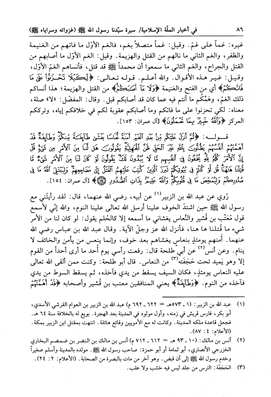 قوله : " ثم أنزل عليكم من بعد آلغم أمنة نعاسا يغشى طائفة قد أهمتهم أنفسهم يظنون بالله غير الحق ظن الجاهلية يقولون هل لنا من الأمر من شئ قل إن الأمر كله لله يخفون في أنفسهم ما لا يبدون لك يقولون لو كان لنا من الأمر شئ ما قتلنا ههنا قل لو كنتم لبرز الذين كتب عليهم القتل إلى مضاجعهم وليبتلى الله ما في صدوركم وليمحص ما في قلوبكم والله عليم بذات الصدور " . روى عن عبد الله بن الزبير عن أبيه ، رضى الله عنهما ، قال : لقد رأيتنى مع رسول الله ( صلى الله عليه وسلم ) حين اشتد الخوف علينا أرسل الله تعالى علينا النوم ، والله إني لأسمع قول معتب بن قشير والنعاس يغشانى ما أسمه إلا كالحلم يقول : لو كان لنا من الأمر شئ ما قتلنا هاهنا ، فأنزل الله عز وجل الآية . وقال عبد الله ابن عباس رضى الله عنهما . أمنهم يومئذ بنعاس يغشاهم بعد خوف ، وإنما ينبعس من يأمن والخائف لا ينام . وعن أنس عن أبى طلحة قال : رفعت رأسي يوم أحد ما أرى أحدا من القوم إلا وهو يميد تحت حجفيه من النعاس . قال أبو طلحة : وكنت ممن ألقى الله تعالى عليه النعاس يومئذ ، فكان السيف يسقط من يدى فآخذه ، ثم يسقط السوط من يدي فآخذه من النوم . وطائفة يعنى المنافقين معتب بن قشير وأصحابه قد أهمتهم
