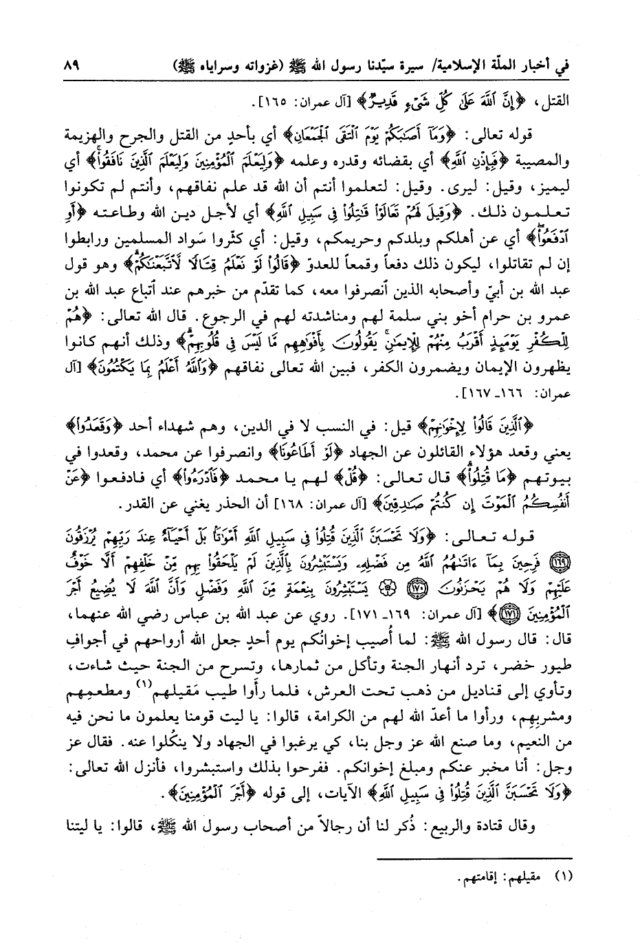 قوله تعالى : " وما أصابكم يوم آلتقى الجمعان " أي بأحد من القتل والجرح والهزيمة والمصيبة فبإذن الله أي بقضائه وقدره وعلمه وليعلم المؤمنين وليعلم الذين نافقوا أي ليميز ، وقيل : ليرى . وقيل : لتعلموا أنتم أن الله قد علم نفاقهم ، وأنتم لم تكونوا تعلمون ذلك . وقيل لهم تعالوا قاتلوا في سبيل الله أي لأجل دين الله وطاعته أو آدفعوا أي عن أهلكم وبلدكم وحريمكم ، وقيل : أي كثروا سواد المسلمين وربطوا إن لم تقاتلوا ، ليكون ذلك دفعا وقمعا للعدو قالوا لو نعلم قتالا لاتبعناكم وهو قول عبد الله بن أبى وأصحابه الذين آنصرفوا معه ، كما تقدم من خبرهم عند آتباع عبد الله بن عمرو بن حرام أخو بنى سلمة لهم ومناشدته لهم في الرجوع . قال الله تعالى : " هم للكفر يومئذ أقرب منهم للإيمان يقولون بأفواههم ما ليس في قلوبهم " وذلك أنهم كانوا يظنون الإيمان ويضمرون الكفر ، فبين الله تعالى نفاقهم " والله أعلم بما يكتمون . " قوله تعالى : " الذين قالوا لإخوانكم " قيل : في النسب لا في الدين ، وهم شهداء أحد . وقعدوا يعنى وفعد هؤلاء القائلون عن الجهاد لو أطاعونا وآنصرفوا عن محمد ، وقعدوا في بيوتهم ما قتلوا قال تعالى : قل لهم يا محمد فادرءوا أي فادفعوا عن أنفسكم الموت إن كنتم صادقين أن الحذر يغنى عن القدر . قوله تعالى : " ولا تحسبن الذين قتلوا في سبيل الله أمواتا بل أحياء عند ربهم يرزقون . فرحين بما آتاهم الله من فضله ويستبشرون بالذين لم يلحقوا بهم من خلفهم ألا خوف عليهم ولا هم يحزنون . يستبشرون بنعمة من الله وفضل وأن الله لا يضيع أجر المؤمنين " روى عن عبد الله بن عباس رضى الله عنهما ، قال قال رسول الله ( صلى الله عليه وسلم ) : لما أصيب إخوانكم يوم أحد جعل الله أرواحهم في أجواف طيور خضر ، ترد أنهار الجنة وتأكل من ثمارها ، وتسرح من الجنة حيث شاءت ، وتأوى إلى قناديل من ذهب تخت العرش ، فلما رأوا طيب مقيلهم ومطعمهم ومشربهم ، ورأوا ما أعد الله لهم من الكرامة ، قالوا : ياليت قومنا يعلمون ما نحن فيه من النعيم ، وما صنع الله عز وجل بنا ، كى يرغبوا في الجهاد ولا ينكلوا عنه . فقال عز وجل : أنا مخبر عنكم ومبلغ إخوانكم . ففرحوا بذلك وآستبشروا ، فأنزل الله تعالى : " ولا تحسبن الذين قتلوا في سبيل الله " الآيات ، إلى قوله أجر المؤمنين .