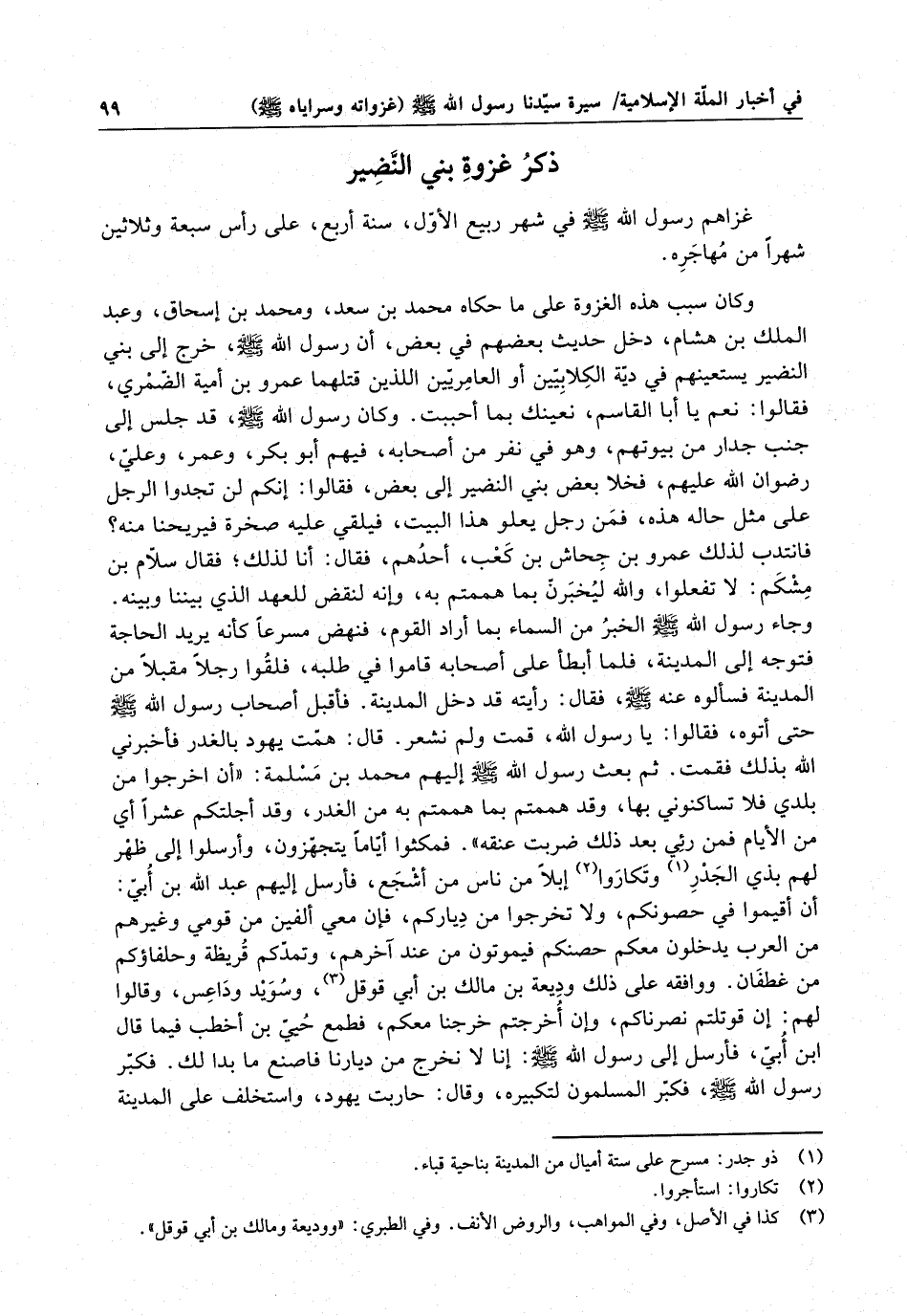 قال : همت يهود بالغدر فأخبرنى الله بذلك فقمت . ثم بعث رسول الله ( صلى الله عليه وسلم ) إليهم محمد بن مسلمة : أن اخرجوا من بلدى فلا تساكنونى بها ، وقد هممتم بما هممتم به من الغدر ، وقد أجلتكم عشرا أي من الأيام فمن رئى بعد ذلك ضربت عنقه . فمكثوا أياما يتجهزون ، وأرسلوا إلى ظهر لهم بذي الجدر وتكاروا إبلا من ناس من أشجع ، فأرسل إليهم عبد الله بن أبى : أن أقيموا في حصونكم ، ولا تخرجوا من دياركم ، فإن معى ألفين من قومى وغيرهم من العرب يدخلون معكم حصنكم فيموتون من عند آخرهم ، وتمدكم قريظة وحلفاؤكم من غطفان . ووافقه على ذلك وديعة بن مالك بن أبى قوقل ، وسويد وداعس ، وقالوا لهم : إن نصرناكم ، وإن أخرجتم خرجنا معكم ، فطمع حي بن أخطب فيما قال آبن أبى ، فأرسل إلى رسول الله ( صلى الله عليه وسلم ) : إنا لا نخرج من ديارنا فاصنع ما بدا لك . فكبر رسول الله ( صلى الله عليه وسلم ) ، فكبر المسلمون لتكبيره ، وقال : حاربت يهود . واستخلف على المدينة