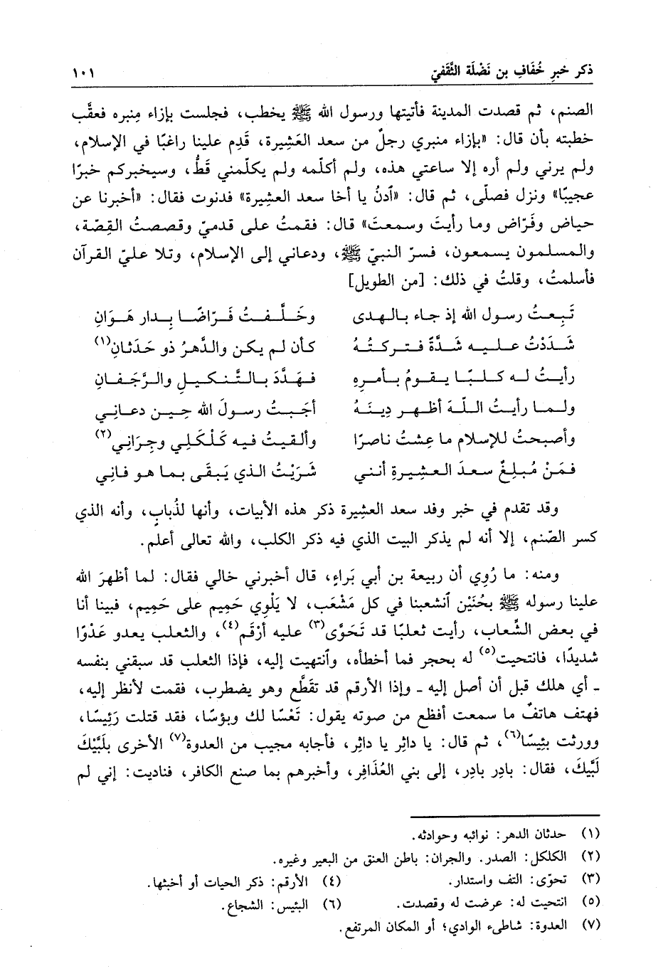 الصنم ، ثم قصدت المدينة فأتيتها ورسول الله ( صلى الله عليه وسلم ) يخطب ، فجلست بإزاء منبره فعقب خطبته بأن قال : " بإزاء منبري رجلٌ من سعد العشيرة ، قدم علينا راغباً في الإسلام ، لم يرني ولم أره إلا ساعتي هذه ، ولم أكلمه ولم يكلمني قط ، وسيخبركم خبرا عجيبا " ونزل فصلى ، ثم قال : " أدن يا أخا سعد العشيرة " فدنوت فقال : " أخبرنا عن حياض وفراض وما رأيت وما سمعت " قال : فقمت على قدمي وقصصت القصة ، والمسلمون يسمعون ، فسر النبي ( صلى الله عليه وسلم ) ، ودعاني إلى الإسلام ، وتلا علىّ القرآن فأسلمت ، وقلت في ذلك :