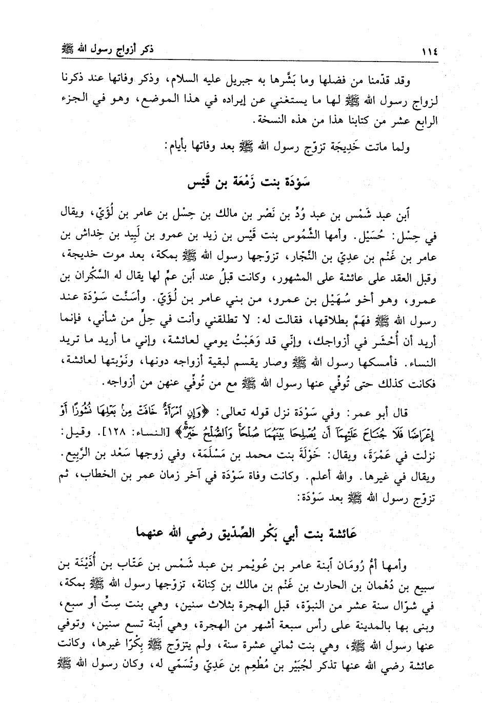 قال أبو عمر : وفي سودة نزل قوله تعالى : " وإن امرأةٌ خافت من بعلها نشوزاً أو إعراضاً فلا جناح عليهما أن يصلحا بينهما صلحاً والصلح خير " . وقيل : " نزلت في عمرة ، ويقال : خولة بنت محمد بن مسلمة ، وفي زوجها سعد بن الربيع . ويقال في غيرها . والله أعلم . وكانت وفاة سودة في آخر زمان عمر بن الخطاب ، ثم تزوج رسول الله ( صلى الله عليه وسلم ) بعد سودة :