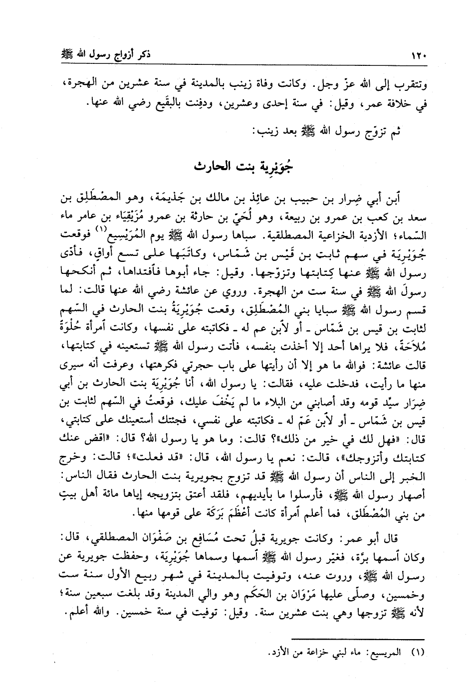 قال أبو عمر : وكانت جويرية قبل تحت مسافع بن صفوان المصطلقي ، قال : وكان اسمها برة ، فغير رسول الله ( صلى الله عليه وسلم ) اسمها وسماها جويرية ، وحفظت جويرية عن رسول الله ( صلى الله عليه وسلم ) ، وروت عنه ، وتوفيت في المدينة في شهر ربيع الأول سنة ست وخمسين ، وصلى عليها مروان بن الحكم وهو والي المدينة وقد بلغت سبعين سنة ؛ لأنه ( صلى الله عليه وسلم ) تزوجها وهي بنت عشرين سنة . وقيل : توفيت في سنة خمسين . والله أعلم .