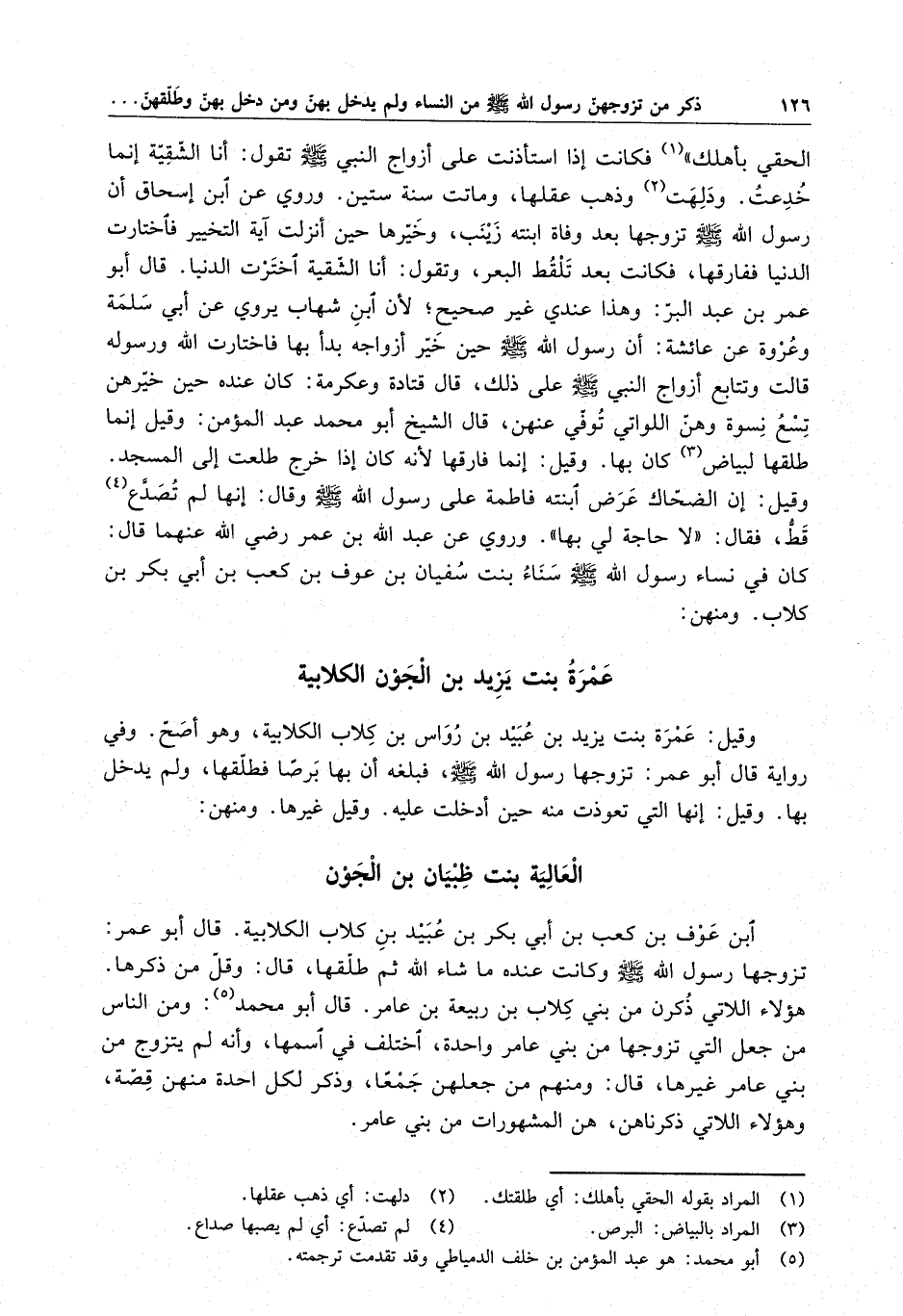 وقيل : عمرة بنت يزيد بن عبيد بن رواس بن كلاب الكلابية ، وقد أصح . وفي رواية قال أبو عمر : تزوجها رسول الله ( صلى الله عليه وسلم ) ، فبلغه أن بها برصاً فطلقها ، ولم يدخل بها .