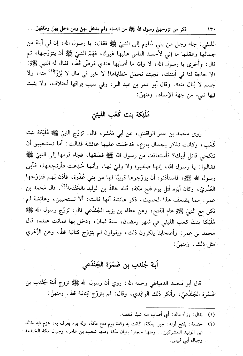 روى محمد بن عمر الواقدي ، عن أبي معشر ، قال : تزوج النبي ( صلى الله عليه وسلم ) مليكة بنت كعب ، وكانت تذكر بجمال بارع ، فدخلت عليها عائشة فقالت : أما تستحيين أن تنكحي قاتل أبيك ؟ فاستعاذت من رسول الله ( صلى الله عليه وسلم ) فطلقها ، فجاء قومها إلى النبي ( صلى الله عليه وسلم ) فقالوا : يا رسول الله ، إنها صغيرة ولا ولي لها ، وأنها خدعت فارتجعها ، فأبى رسول الله ( صلى الله عليه وسلم ) ، فاستأذنوه أن يزوجوها قريباً لها من بني عذرة ، فأذن لهم فتزوجها العذري ، وكان أبوها قتل يوم فتح مكة ، قتله خالد بن الوليد بالخندمة . قال محمد بن عمر : مما يضعف هذا الحديث ، ذكر عائشة أنها قالت : ألا تستحيين ، وعائشة لم تكن مع النبي ( صلى الله عليه وسلم ) عام الفتح ، وعن عطاء بن يزيد الجندعي قال : تزوج رسول الله ( صلى الله عليه وسلم ) مليكة بنت كعب الليثي في شهر رمضان ، سنة ثمان ، ودخل بها فماتت عنده ، قال محمد بن عمر : وأصحابنا ينكرون ذلك ، ويقولون لم يتزوج كنانية قط ، وعن الزهري مثل ذلك . ومنهن :