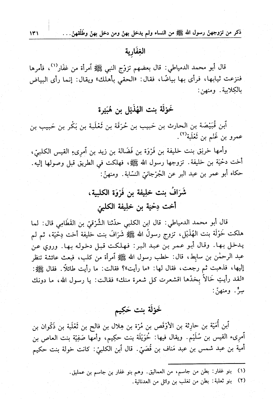 قال أبو محمد الدمياطي : قال بعضهم تزوج النبي ( صلى الله عليه وسلم ) امرأة من غفار ، فأمرها فنزعت ثيابها ، فرأى بها بياضاً ، فقال : " الحقي بأهلك " ويقال : إنما رأى البياض بالكلابية . ومنهن :