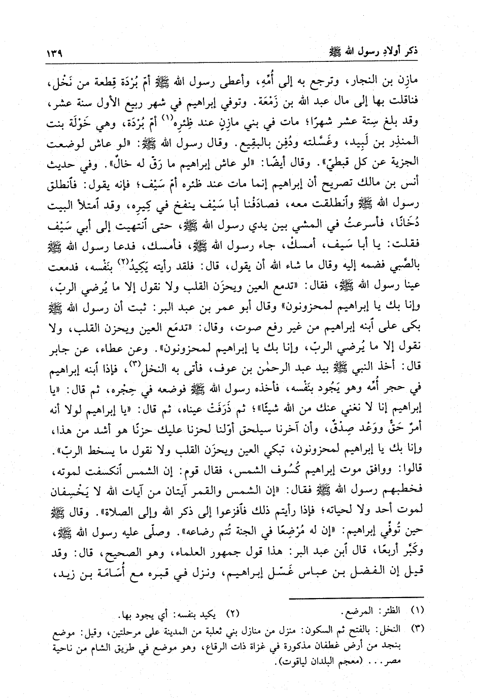 مازن بن النجار ، وترجع به إلى أمه ، وأعطى رسول الله ( صلى الله عليه وسلم ) أم بردة قطعة من نخل ، فناقلت بها إلى مال عبد الله بن زمعة . وتوفي إبراهيم في شهر ربيع الأول سنة عشر ، وقد بلغ ستة عشر شهراً ؛ مات في بني مازنٍ عند ظئره أم بردة ، وهي خولة بنت المنذر بن لبيد ، وغسلته ودفن بالبقيع . وقال رسول الله ( صلى الله عليه وسلم ) : " لو عاش لوضعت الجزية عن كل قبطي " . وقال أيضاً : " لو عاش إبراهيم ما رق له خالٌ " . وفي حديث أنس بن مالك تصريح أن إبراهيم إنما مات عند ظئره أم سيف ؛ فإنه يقول : فانطلق رسول الله ( صلى الله عليه وسلم ) وانطلقت معه ، فصادفنا أبا سيف ينفخ في كيره ، وقد امتلأ البيت دخاناً ، فأسرعت في المشي بين يدي رسول الله ( صلى الله عليه وسلم ) ، حتى انتهيت إلى أبي سيف فقلت : يا أبا سيف ، أمسك ، جاء رسول الله ( صلى الله عليه وسلم ) ، فأمسك ، فدعا رسول الله ( صلى الله عليه وسلم ) بالصبي فضمه إليه وقال ما شاء الله أن يقول ، قال : فلقد رأيته يكيد بنفسه ، فدمعت عينا رسول الله ( صلى الله عليه وسلم ) ، فقال : " تدمع العين ويحزن القلب ولا نقول إلا ما يرضي الرب ، وإنا بك يا إبراهيم لمحزونون " وقال أبو عمر بن عبد البر : ثبت أن رسول الله ( صلى الله عليه وسلم ) بكى على ابنه إبراهيم من غير رفع صوت ، وقال : " تدمع العين ويحزن القلب ولا نقول إلا ما يرضي الرب ، وإنا بك يا إبراهيم لمحزونون " . وعن عطاء ، عن جابر قال : أخذ النبي ( صلى الله عليه وسلم ) بيد عبد الرحمن بن عوف ، فأتى به النخل ، فإذا ابنه إبراهيم في حجر أمه وهو يجود بنفسه ، فأخذه رسول الله ( صلى الله عليه وسلم ) فوضعه في حجره ، ثم قال : " يا إبراهيم إنا لا نغني عنك من الله شيئاً " ؛ ثم ذرفت عيناه ، ثم قال : " يا إبراهيم لولا أنه أمرٌ حقٌ ووعد صدقٌ ، وأن آخرنا سيلحق أولنا لحزنا عليك حزناً هو أشد من هذا ، وإنا بك يا إبراهيم لمحزونون ، تبكي العين ويحزن القلب ولا نقول ما يسخط الرب " . قالوا : ووافق موت إبراهيم كسوف الشمس ، فقال قوم : إن الشمس انكسفت لموته ، فخطبهم رسول الله ( صلى الله عليه وسلم ) فقال : " إن الشمس والقمر آيتان من آيات الله لا يخسفان لموت أحد ولا لحياته ؛ فإذا رأيتم ذلك فافزعوا إلى ذكر الله وإلى الصلاة " . وقال ( صلى الله عليه وسلم ) حين توفي إبراهيم : " إن له مرضعاً في الجنة تتم رضاعه " . وصلى عليه رسول الله ( صلى الله عليه وسلم ) ، وكبّر أربعاً ، قال ابن عبد البر : هذا قول جمهور العلماء ، وهو الصحيح ، قال : وقد قيل إن الفضل بن عباس غسل إبراهيم ، ونزل في قبره مع أسامة بن زيد ،