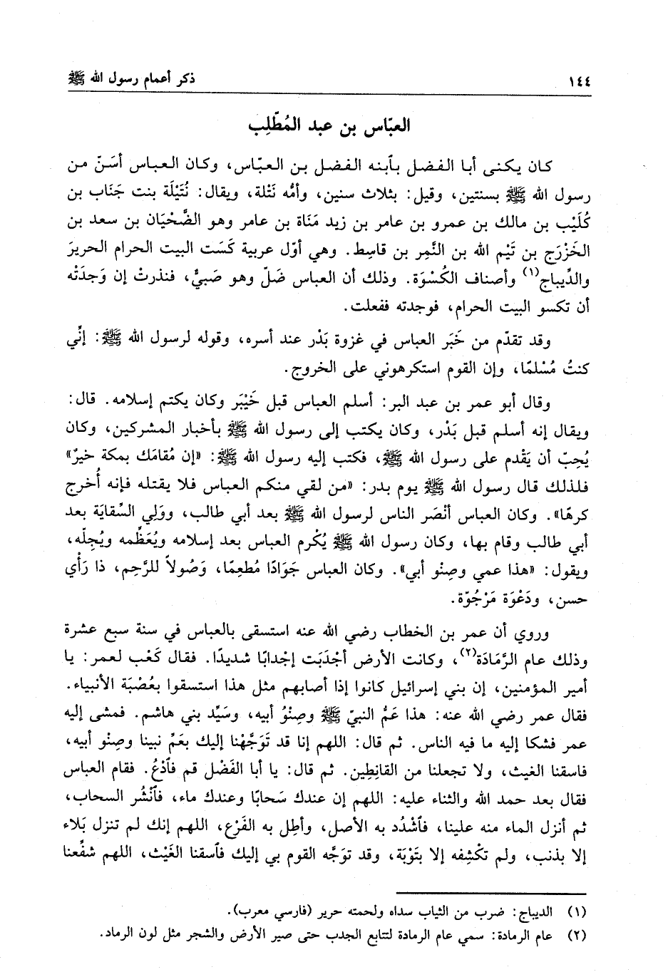 وروي أن عمر بن الخطاب رضي الله عنه استسقى بالعباس في سنة سبع عشرة وذلك عام الرمادة ، وكانت الأرض أجدبت إجداباً شديداً . فقال كعب لعمر : يا أمير المؤمنين ، إن بني إسرائيل كانوا إذا أصابهم مثل هذا استسقوا بعصبة الأنبياء فقال عمر رضي الله عنه ؛ هذا عم النبي ( صلى الله عليه وسلم ) وصنو أبيه ، وسيد بني هاشم . فمشى إليه عمر فشكا إليه ما فيه الناس . ثم قال : اللهم إنا قد توجهنا إليك بعم أبينا وصنو أبيه ، فاسقنا الغيث ، ولا تجعلنا من القانطين . ثم قال : يا أبا الفضل قم فادع . فقام العباس فقال بعد حمد الله والثناء عليه : اللهم إن عندك سحاباً وعندك ماء ، فانشر السحاب ، ثم أنزل الماء منه علينا ، فاشدد به الأصل ، وأطل به الفرع ، اللهم إنك لم تنزل بلاء إلا بذنب ، ولم تكشفه إلا بتوبة ، وقد توجه القوم بي إليك فاسقنا الغيث ، اللهم شفعنا