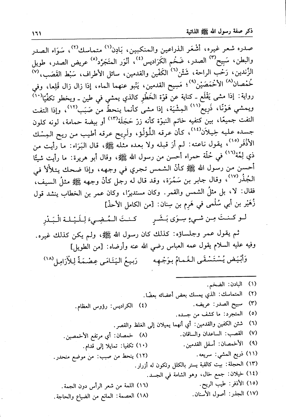 صدره شعر غيره ، أشعر الذراعين والمنكبين ، بادن متماسك ، سواء الصدر والبطن ، سبيح الصدر ، ضخم الكراديس ، أنور المتجرد عريض الصدر ، طويل الزندين ، رحب الراحة ، شثن الكفين والقدمين ، سائل الأطراف ، سبط القصب ، خمصان الأخمصين ، مسيح القدمين ، ينبو عنهما الماء ، إذا زال زال قلعاً ، وفي رواية : إذا مشى يقلع - كناية عن قوة الخطو كالذي يمشي في طين - ويخطو تكفياً ويمشي هونا ، ذريع المشية ، إذا مشى كأنما ينحط من صبب ، وإذا التفت التفت جميعاً ، بين كتفيه خاتم النبوة كأنه زر حجلة أو بيضة حمامة ، لونه كلون جسده عليه خيلان ، كأن عرقه اللؤلؤ ، ولريح عرقه أطيب من ريح المسك الأذفر ، يقول ناعته : لم أر قبله ولا بعده مثله ( صلى الله عليه وسلم ) ، قال البراء : ما رأيت من ذي لمة في حلة حمراء أحسن من رسول الله ( صلى الله عليه وسلم ) ، قال أبو هريرة : ما رأيت شيئاً أحسن من رسول الله ( صلى الله عليه وسلم ) كأن الشمس تجري في وجهه ، وإذا ضحك يتلألأ في الجذر ، وقال جابر بن سمرة ، وقد قال له رجل كأن وجهه ( صلى الله عليه وسلم ) مثل السيف ، فقال : لا ، بل مثل الشمس والقمر . وكان مستديراً ، وكان عمر بن الخطاب ينشد قول زهير بن أبي سلمى في هرم بن سنان :