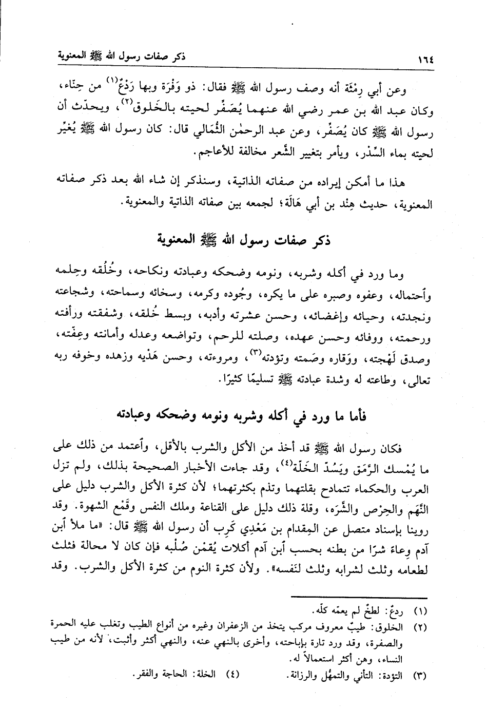 وما ورد في أكله وشربه ، ونومه وضحكه وعبادته ونكاحه ، وخلقه وحلمه واحتماله ، وعفوه وصبره على ما يكره ، وجوده وكرمه . وسخائه وسمحته ، وشجاعته ونجدته ، وحيائه وإغضائه ، وحسن عشرته وأدبه ، وبسط خلقه ، وشفقته ورأفته ورحمته ، ووفائه وحسن عهده ، وصلته للرحم ، وتواضعه وعدله وأمانته وعفته ، وصدق لهجته ، ووقاره وصمته وتؤدته ، ومروءته ، وحسن هديه وزهده وخوفه ربه تعالى ، وطاعته له وشدة عبادته ( صلى الله عليه وسلم ) تسليماً كثيرا .