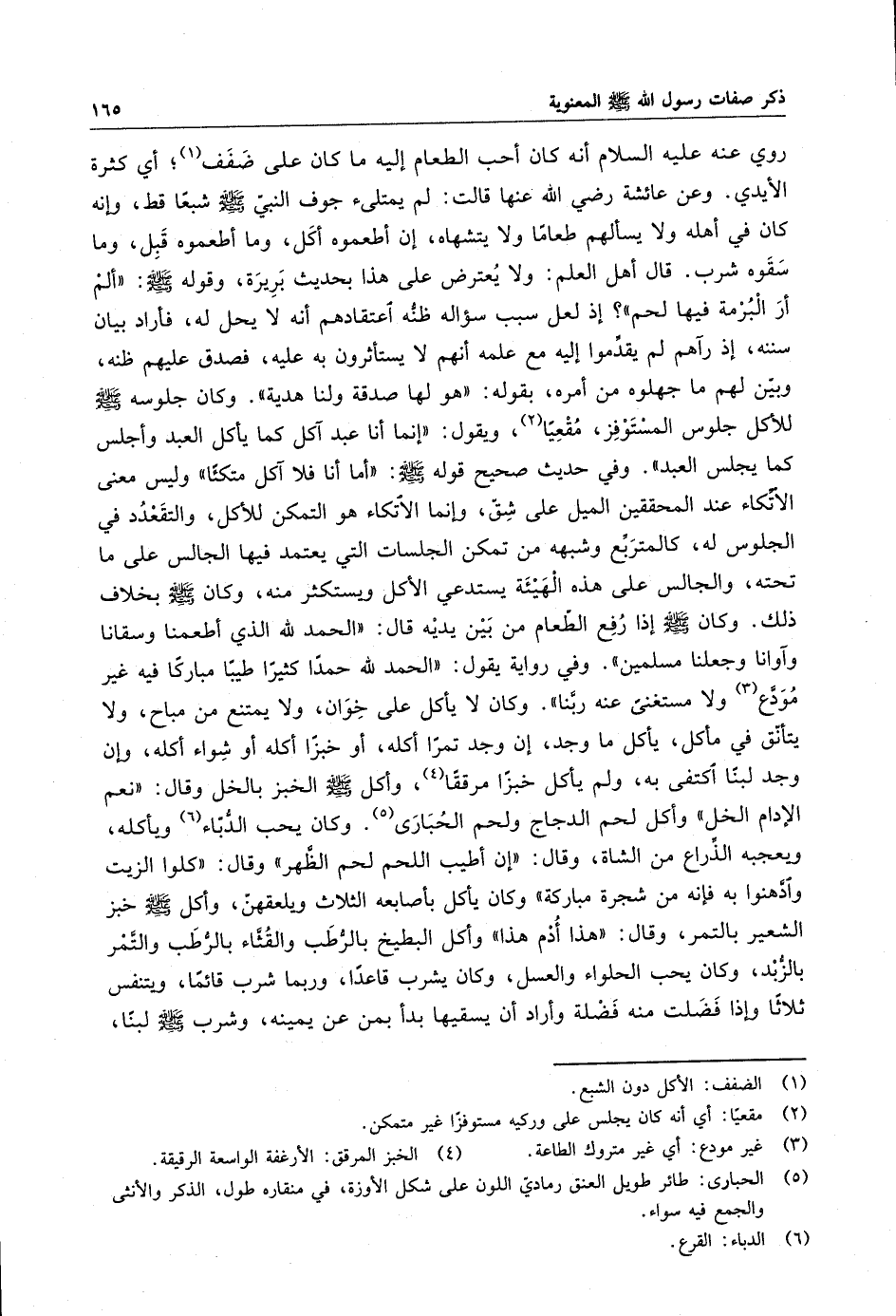 روى عنه عليه السلام أنه كان أحب الطعام إليه ما كان على ضعف ؛ أي كثرة الأيدي . وعن عائشة رضي الله عنها قالت : : لم يمتلئ جوف النبي ( صلى الله عليه وسلم ) شبعا قط ، وإنه كان في أهله ولا يسألهم طعاما ولا يتشهاه ، إن أطعموه أكل ، وما أطعموه قبل ، وما سسقوه شرب . قال أهل العلم : ولا يعترض على هذا بحديث بريرة ، وقوله ( صلى الله عليه وسلم ) : " ألم أر البرمة فيها لحم " ؟ إذ لعل سبب سؤاله ظنه اعتقادهم أنه لا يحل له ، فأراد بيان سننه ، إذ رآهم لم يقدموا إليه مع علمه أنهم لا يستأثرون به عليه ، فصدق عليهم ظنه ، وبين لهم ما جهلوه من أمره ، بقوله : " هو لها صدقة ولنا هدية " . وكان جلوسه ( صلى الله عليه وسلم ) للأكل جلوس المستوفز ، معيقا ، وزيقول : " إنما أنا عبد آكل كما يأكل العبد وأجلس كما يجلس العبد " . وفي حديث صحيح قوله ( صلى الله عليه وسلم ) : " أما أنا فلا آكل متكئا " وليس معنى الأتكاء عند المحققين الميل على شق ، وإنما الإتكاء هو التمكن للأكل ، والتقعدد في الجلوس ، كالمتربع وشبهه من تمكن الجلسات التي يعتد فيها الجالس على ما تحته ، والجالس على هذه الهيئة يستدعى الأكل ويستكثر منه ، وكان ( صلى الله عليه وسلم ) بخلاف ذلك . وكان ( صلى الله عليه وسلم ) إذا رفع الطعام من بين يديه قال : " الحمد لله الذي أطعمنا وسقانا وآوانا وجعلنا مسلمين " . وفي رواية يقول : " الحمد لله حمداً كثيرا طيبا مباركا فيه غير مودع ولا مستغنىً عنه ربنا " . وكن لا يأكل على خوان ، ولا يمتنع من مباح ، ولا يتأنق في مأكل ، يأكل ما وجد ، إن وجد تمرا أكله ، أو خبزا أكله أو شواء أكله ، وإن وجد لبنا أكتفى به ، ولم يأكل خبزاً مرققا ، وأكل ( صلى الله عليه وسلم ) الخبز بالخل وقال : " نعم الإدام الخل " وأكل لحم الدجاج ولحم الحبارى .