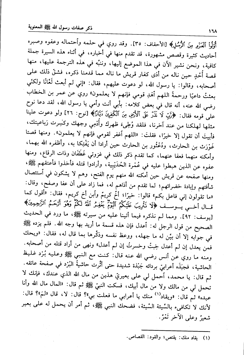 أولو العزم من الرسل " . وقد روى في حلمه واحتماله وعفوه وصبره أحاديث كثيرة وقصص مشهورة ، قد تقدم منها في أخباره ، في أثناء هذه السيرة جملة كافية ونحن نشير الآن في هذا الموضع إليها ، وننبه في هذه الترجمة عليها ، منها قصة أحدٍ حين ناله من أذى كفار قريش ما ناله مما قدمنا ذكره ، فشق ذلك على أصحابه ، وقالوا : يا رسول الله ، لو دعوت عليهم ، فقال : " إني لم أبعث لعّانا ولكني بعثت داعياً ورحمةً اللهم اهد قومي فإنهم لا يعلمون " روى عن عمر بن الخطاب رضي الله عنه ، أنه قال في بعض كلامه : بأبي أنت وأمي يا رسول الله ، لقد دعا نوح على قومه فقال : " رب لا تذر على الأرض من الكافرين ديّارا " ولو دعوت علينا مثلها لهلكنا من عند آخرنا ، فلقد وطيء ظهرك وأدمى وجهك وكسرت رباعيتك ، فأبيت أن تقول إلا خيرا ، فقلت : " اللهم اغفر لقومي فإنهم لا يعلمون " . ومنها قصتا غورث بن الحارث ، ودعثور بن الحارث حين أرادا أن يفتكا به ، وأظفره الله بهما ، وأمكنه منهما فعفا عنهما ، كما تقدم ذكر ذلك في غزوتي غطفان وذات الرقاع ، ومنها عفو عن الذين هبطوا عليه في عمرة الحديبية ، وأرادوا قتله فأخذوا فأعتقهم ( صلى الله عليه وسلم ) ، ومنها صفحه عن قريش حين أمكنه الله منهم يوم الفتح ، وهم لا يشكون في استئصال شأفتهم وإبادة خضرائهم ؛ لما تقدم من أذاهم له ، فما زاد على أن عفا وصفح ، وقال : " ما تقولون إني فاعل بكم " : خيرا ؛ أخٌ كريمٌ وابن أخ كريم ، فقال : " أقول كما قال أخي يوسف " لا تثريب عليكم اليوم يغفر الله لكم وهو أرحم الراحمين " . ومما لم نذكره فما أتينا عليه من سيرته ( صلى الله عليه وسلم ) ما ورد في الحديث الصحيح من قول الرجل له : اعدل إن هذه قسمة ما أريد بها وجه الله . فلم يزده ( صلى الله عليه وسلم ) في جوابه إلا أن بين له ما جهله ، ووعظ نفسه وذكرها بما قال له ، فقال : " ويحك فمن يعدل إن لم أعدل خبت وخسرت إن لم أعدل " ونهى ما أراد قتله من أصحابه . ومنه ما روى عن أنس رضي الله عنه قال : كنت مع النبي ( صلى الله عليه وسلم ) وعليه برد غليظ الحاشية ، فجبذه أعرابي بردائه جبذة شديدة حتى أثّرت حاشية البرد في صفحة عاتقه . ثم قال : يا محمد ، أحمل لي على بعيريّ هذين من مال الله الذي عندك ، فإنك لا تحمل لي من مالك ولا من مال أبيك ، فسكت النبي ( صلى الله عليه وسلم ) ثم قال : " المال مال الله وأنا عبده " ثم قال : " ويقاد منك يا أعرابي ما فعلت بي " ؟ قال : لا ، قال " لم " ؟ قال : لأنك لا تكافيء بالسيئة السيئة ، فضحك النبي ( صلى الله عليه وسلم ) ، ثم أمر أن يحمل له على بعير شعيرٌ وعلى الآخر تمرٌ .