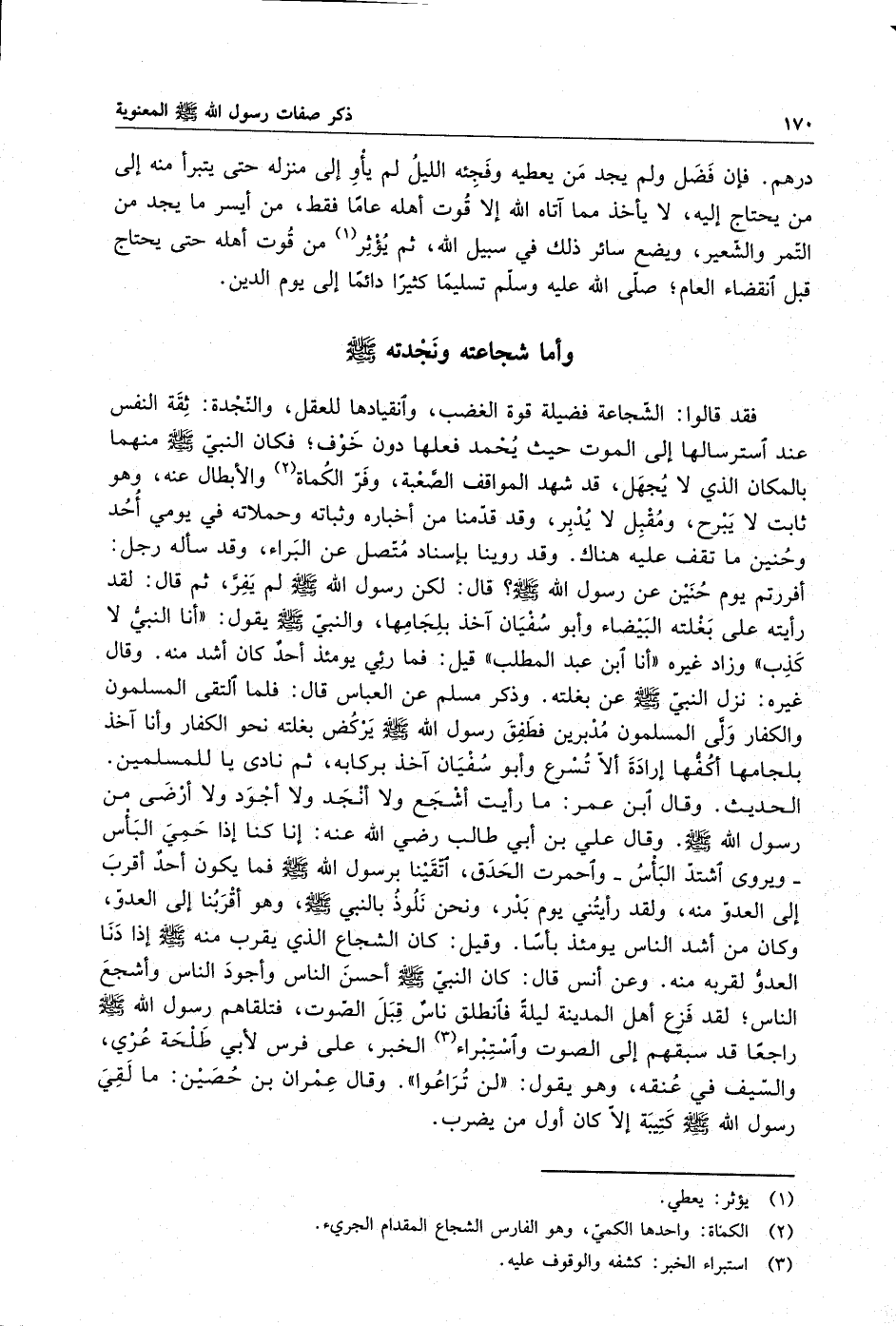 فقد قالوا : الشجاعة فضيلة قوة الغضب ، وانقيادها للعقل ، والنّجدة : ثقة النفس عند استرسالها إلى الموت حيث يحمد فعلها دون خوف ؛ فكان النبي ( صلى الله عليه وسلم ) منهما بالمكان الذي لا يجهل ، قد شهد المواقف الصعبة ، وفرّ الكماة والأبطال عنه ، وهو ثابت لا يبرح ، ومقبل لا يدبر ، وقد قدّمنا من أخباره وثباته وحملاته في يومي أحد وحنين ما تقف عليه هناك . وقد روينا بإسناد متّصل عن البراء ، وقد سأله رجل : أفررتم يوم حنين عن رسول الله ( صلى الله عليه وسلم ) ؟ قال : لكن رسول الله ( صلى الله عليه وسلم ) لم يفرّ ، ثم قال : لقد رأيته على بغلته البيضاء وأبو سفيان آخذ بلجامها ، والنبي ( صلى الله عليه وسلم ) يقول : " أنا النبي لا أكذب " وزاد غيره " أنا ابن عبد المطلب " قيل : فمارئ يومئذ أحدٌ كان أشد منه . وقال غيره : نزل النبي ( صلى الله عليه وسلم ) عن بغلته . وذكر مسلم عن العباس قال : فلما التقى المسلمون والكفار ولّى المسلمون مدبرين فطفق رسول الله ( صلى الله عليه وسلم ) يركض بغلته نحو الكفار وأنا آخذ بلجامها أكفّها إرادة ألا تسرع وأبو سفيان آخذ بركابه ، ثم نادى ياللمسلمين . الحديث . وقال ابن عمر : ما رأيت أشجع ولا أنجد ولا أجود ولا أرضى من رسول الله ( صلى الله عليه وسلم ) . وقال علي بن أبي طالب رضي الله عنه : إنا كما إذا حمي البأس - ويروى اشتدّ البأس - واحمرت الحدق ، اتقينا برسول الله ( صلى الله عليه وسلم ) فما يكون أحدٌ أقرب إلى العدو منه ، ولقد رأيتني يوم بدر ، ونحن نلوذ بالنبي ( صلى الله عليه وسلم ) ، وهو أقربنا إلى العدو ، وكان من أشد الناس يومئذ بأسا . وقيل : كان الشجاع الذي يقرب منه ( صلى الله عليه وسلم ) إذا دنا العدو لقربه منه .