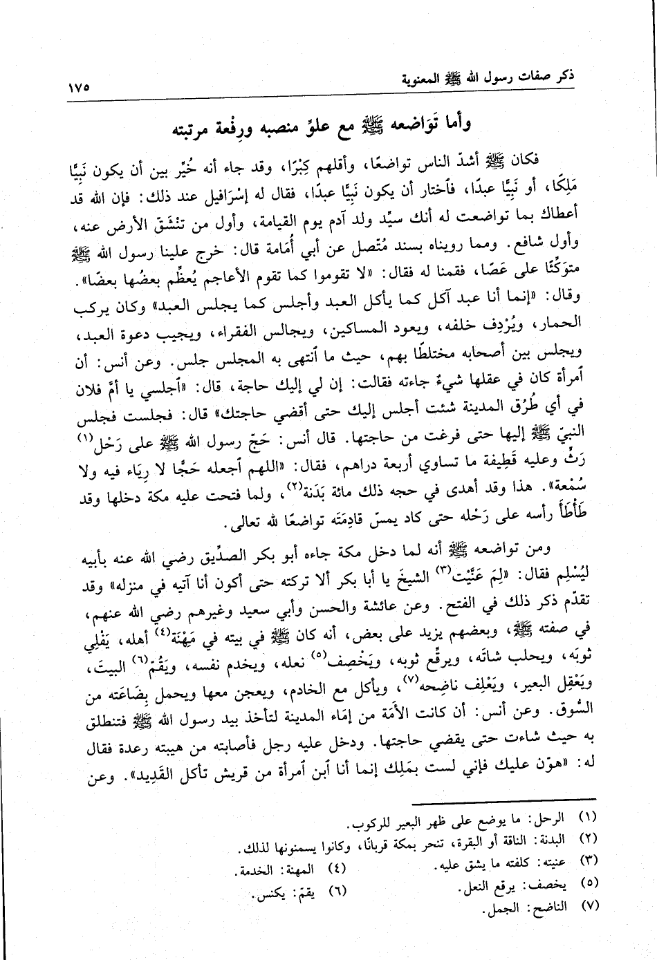 فكان ( صلى الله عليه وسلم ) أشد الناس تواضعاً ، وأقلهم كبراً ، وقد جاء أنه خيّر بين أن يكون نبيّاً ملكاً ، أو نبيّاً عبداً ، فاختار أن يكون نبياً عبداً ، فقال له إسرافيل عند ذلك : فإن الله قد أعطاك بما تواضعت له أنك سيد ولد آدم يوم القيامة ، وأول من تنشق الأرض عنه ، وأول شافع . ومما رويناه بسند متصل عن أبي أمامة قال : خرج علينا رسول الله ( صلى الله عليه وسلم ) متوكئاً على عصاً ، فقمنا له فقال : " لا تقوموا كما تقوم الأعاجم يعظم بعضها بعضاً " . وقال : " إنما أنا عبدٌ آكل كما يأكل العبد وأجلس كما يجلس العبد " وكان يركب الحمار ، ويردف خلفه ، ويعود المساكين ، ويجالس الفقراء ، ويجيب دعوة العبد ، ويجلس بين أصحابه مختلطاً بهم ، حيث ما انتهى به المجلس جلس ، وعن أنس : أن امرأة كان في عقلها شيءٌ جاءته فقالت : إن لي إليك حاجة ، قال : " اجلسي يا أم فلان في أي طرق المدينة شئت أجلس إليك حتى أقضي حاجتك " قال : فجلست فجلس النبي ( صلى الله عليه وسلم ) إليها حتى فرغت من حاجتها . قال أنس : حجّ رسول الله ( صلى الله عليه وسلم ) على رحل رثٍّ وعليه قطيفة ما تساوي أربعة دراهم ، فقال : " اللهم اجعله حجًّا لا رياء فيه ولا سمعة " . هذا وقد أهدى في حجة ذلك مائة بدنة ، ولما فتحت عليه مكة دخلها وقد طأطأ رأسه على رحله حتى كاد يمسّ قادمته تواضعاً لله تعالى .