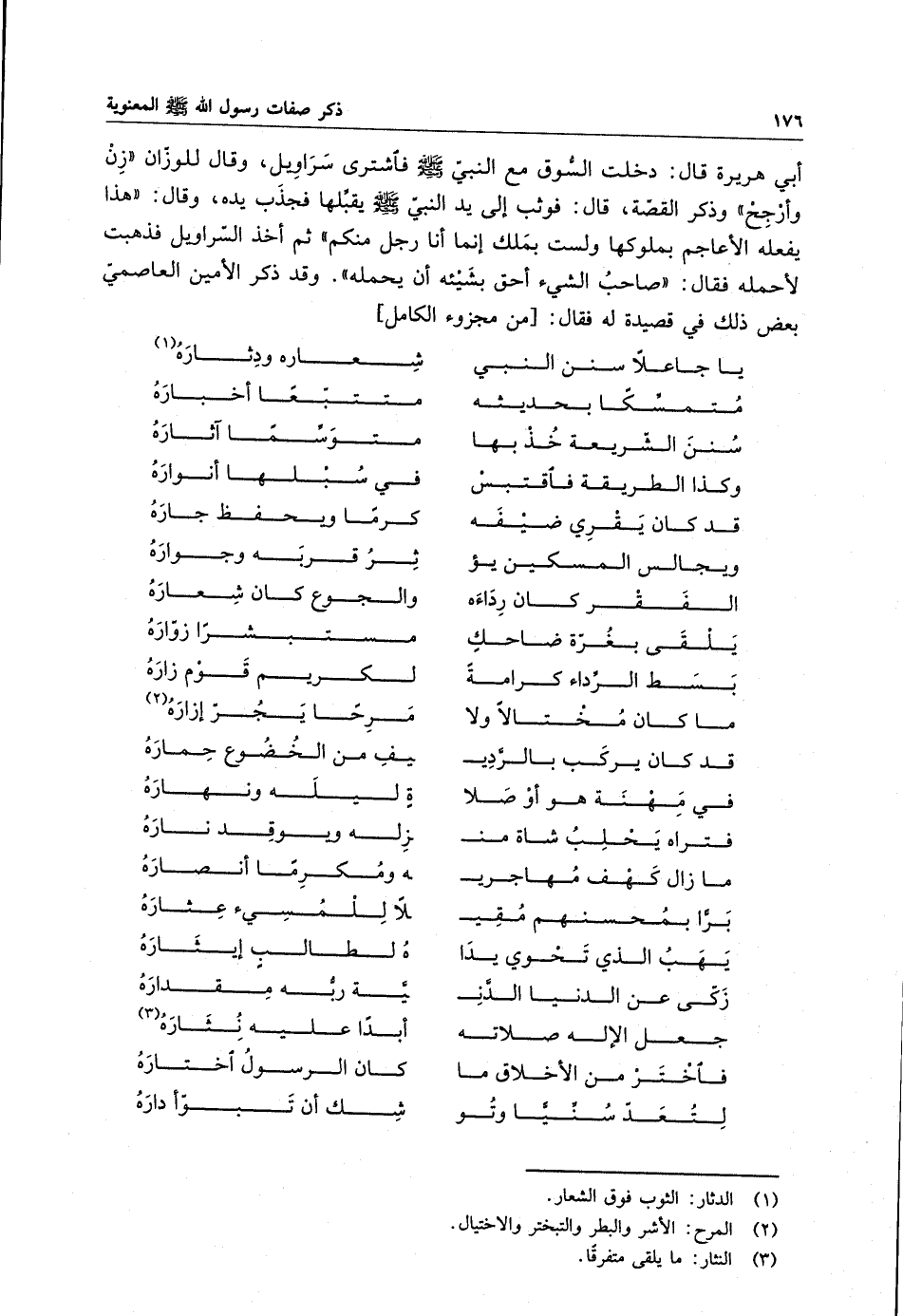 أبي هريرة قال : دخلت السوق مع النبي ( صلى الله عليه وسلم ) فاشترى سراويل ، وقال للوزّان : " زن وأرجح " وذكر القصة ، قال : فوثب إلى يد النبي ( صلى الله عليه وسلم ) يقبّلها فجذب يده ، وقال : " هذا يفعله الأعاجم بملوكها ولست بملك إنما أنا رجل منكم " ثم أخذ السراويل فذهبت لأحمله فقال : " صاحب الشيء أحق بشيئه أن يحمله " . وقد ذكر الأمين العاصمي بعض ذلك في قصيدة له فقال :