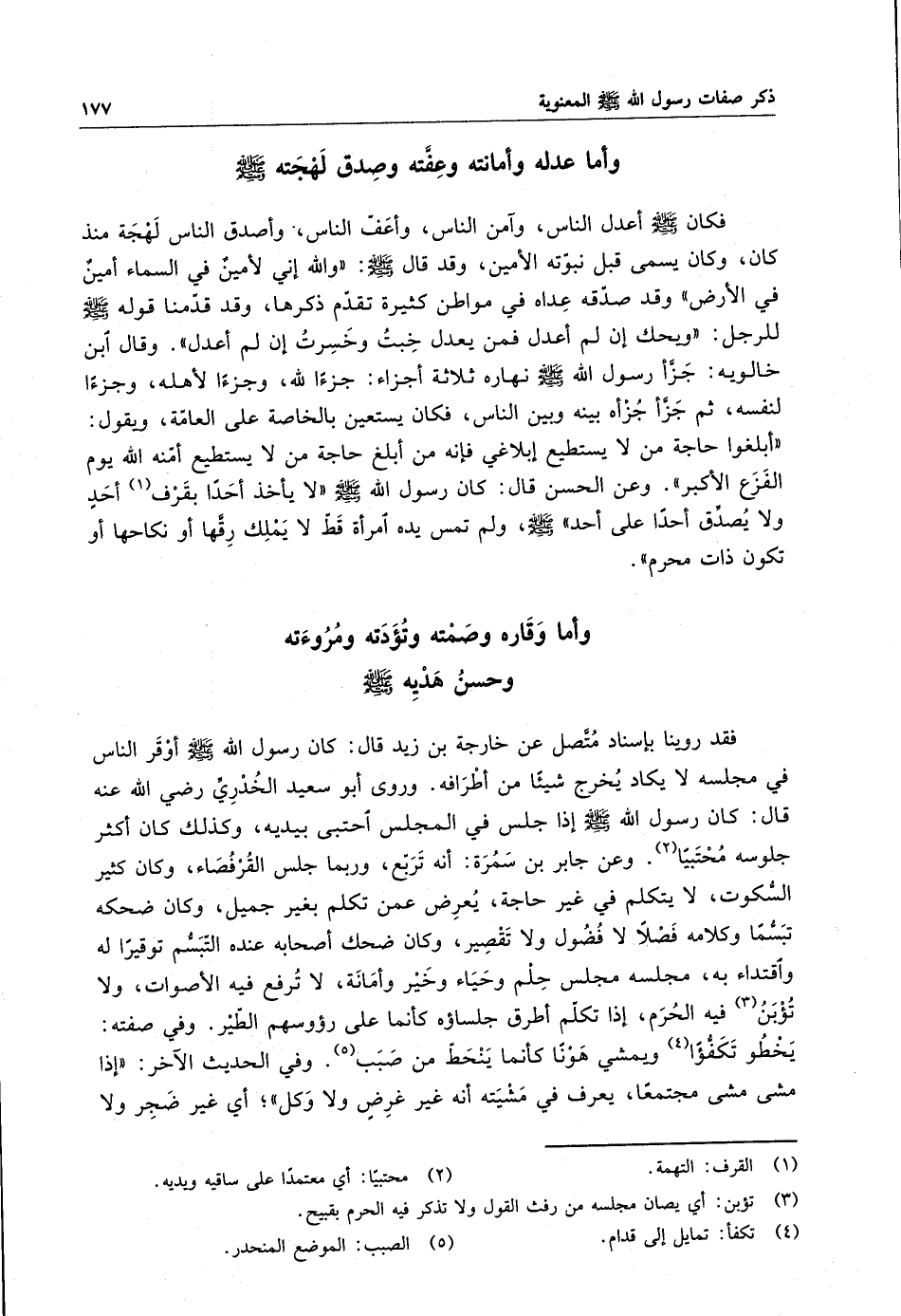 فقد روينا بإسناد متصل عن خارجة بن زيد قال : كان رسول الله ( صلى الله عليه وسلم ) أوقر الناس في مجلسه لا يكاد يخرج شيئاً من أطرافه . وروى أبو سعيد الخدري رضي الله عنه قال : كان رسول الله ( صلى الله عليه وسلم ) إذا جلس في المجلس احتبى بيديه ، وكذلك كان أكثر جلوسه محتبيا . وعن جابر بن سمرة : أنه تربع ، وربما جلس القرفصاء ، وكان كثير السكوت ، لا يتكلم في غير حاجة ، يعرض عمن تكلم بغير جميل ، كان ضحكه تبسماً وكلامه فصلاً لا فضول ولا تقصير ، وكان ضحك أصحابه عنده التبسم توقيراً له واقتداءً به ، مجلسه مجلس حلم وحياء وخير وأمانة ، لا ترفع فيه الأصوات ، ولا تؤبن فيه الحرم ، إذا تكلم أطرق جلساؤه كأنما على رءوسهم الطير . وفي صفته : يخطو تكفّؤاً ويمشي هوناً كأنما ينحط من صبب . وفي الحديث الآخر : " إذا مشى مشى مجتمعا ، يعرف في مشيته أنه غير غرضٍ ولا وكل ؛ أي غير ضجر ولا