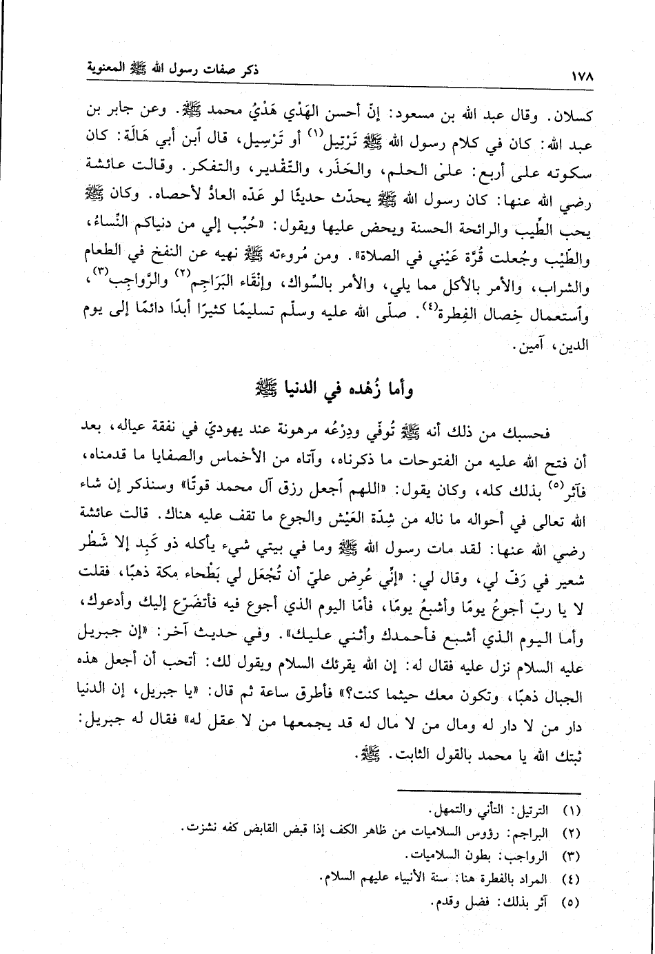 كسلان . وقال عبد الله بن مسعود : إنّ أحسن الهدي هدي محمد ( صلى الله عليه وسلم ) . وعن جابر بن عبد الله : كان في كلام رسول الله ( صلى الله عليه وسلم ) ترتيل أو ترسيل ، قال ابن أبي هالة : كان سكوته على أربع : على الحلم ، والحذر ، والتقدير ، والتفكر . وقالت عائشة رضي الله عنها : كان رسول الله ( صلى الله عليه وسلم ) يحدث حديثاً لو عدّه العادّ لأحصاه . وكان ( صلى الله عليه وسلم ) يحب الطيب والرائحة الحسنة ويحض عليها ويقول : " حبّب إليّ من دنياكم النساء ، والطّيب وجعلت قرّة عيني في الصلاة " . ومن مروءته ( صلى الله عليه وسلم ) نهيه عن النفخ في الطعام والشراب ، والأمر بالأكل مما يلي ، والأمر بالسواك ، وإنقاء البراجم والرّواجب ، واستعمال خصال الفطرة . ( صلى الله عليه وسلم ) تسليماً كثيراً أبدى دائماً إلى يوم الدين ، آمين .