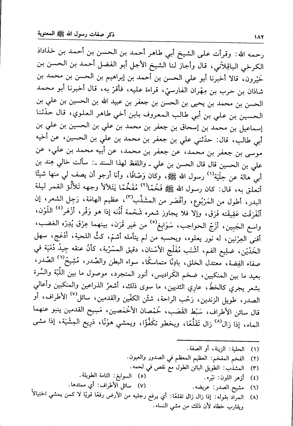 رحمه الله : وقرأت على الشيخ أبي طاهر أحمد بن الحسن بن أحمد بن خذاداذ الكرخي الباقلاني ، قال وأجاز لنا الشيخ الأجل أبو الفضل أحمد بن الحسن بن خيرون ، قالا أخبرنا أبو علي الحسن بن أحمد بن إبراهيم بن الحسن بن محمد بن شاذان بن حرب بن مهران الفارسي ، قراءة عليه ، فأقر به ، قال أخبرنا أبو محمد الحسن بن محمد بن يحيى ابن الحسن بن جعفر بن عبيد الله بن الحسين بن علي بن الحسين : أن علي بن أبي طالب المعروف بابن أخي طاهر العلوي ، قال حدثنا إسماعيل بن محمد ابن إسحاق بن جعفر بن محمد بن علي بن الحسين بن علي بن أبي طالب ، قال : حدثني علي بن جعفر بن محمد بن علي بن الحسين ، عن أخيه موسى بن جعفر ابن محمد ، عن جعفر بن محمد ، عن أبيه محمد بن علي ، عن علي بن الحسين قال قال الحسن بن علي - واللفظ لهذا السند - : سألت خالي هند بن أبي هالة عن حلية رسول الله ( صلى الله عليه وسلم ) ، وكان وصافا ، وأنا أرجو أن يصف لي منها شيئا أتعلق به ، قال : كان رسول الله ( صلى الله عليه وسلم ) فخما مفخما يتلألأ وجهه تلألؤ القمر ليلة البدر ، أطول من المربوع ، وأقصر من المشذب ، عظيم الهامة ، رجل الشعر ، إن انفرقت عقيقته فرق ، وإلا فلا يجاوز شعره شحمة أذنه إذا هو وفر ، أزهر اللون ، واسع الجبين ، أزج الحواجب ، سوابغ من غير قرن ، بينهما عرق يدرّه الغضب ، أقنى العرنين ، له نور يعلوه ، ويحسبه من لم يتأمله أشم ، كثّ اللحية ، أدعج ، سهل الخدين ، ضليع الفم ، أشنب مفلج الأسنان ، دقيق المسربة ، كأن عنقه جيد دمية في صفاء الفضة ، معتدل الخلق ، بادنا متماسكا ، سواء البطن والصدر ، مشيح الصدر ، بعيد ما بين المنكبين ، ضخم الكراديس ، أنور المتجرد ، موصول ما بين اللبة والسرة بشعر يجري كالخط ، عاري الثديين ، ما سوى ذلك ، أشعر الذراعين والمنكبين وأعالي الصدر ، طويل الزندين ، رحب الراحة ، شثن الكفين والقدمين ، سائل الأطراف ، أو قال سائن الأطراف ، سبط القصب خمصان الأخمصين ، مسيح القدمين ينبو عنها الماء ، إذا زال زال تقلعاً ، ويخطو تكفؤا ، ويمشي هونا ، ذريع المشية ، إذا مشى