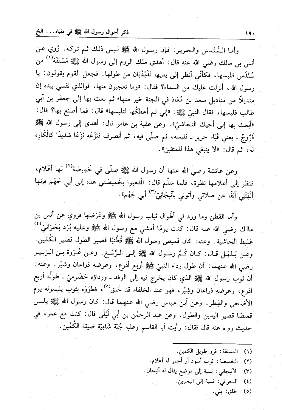 وأما القطن وما ورد في أطوال ثياب رسول الله ( صلى الله عليه وسلم ) وعرضها فروي عن أنس بن مالك رضي الله عنه قال : كنت يوماً أمشي مع رسول الله ( صلى الله عليه وسلم ) برد بحراني غليظ الحاشية . وعنه كان قميص رسول الله ( صلى الله عليه وسلم ) قطنياً قصير الطول قصير الكمين . وعن بديل قال : كان كم رسول الله ( صلى الله عليه وسلم ) إلى الرسغ . وعن عروة بن الزبير رضي الله عنهما : أن طول رداء النبي ( صلى الله عليه وسلم ) أربع أذرع ، وعرضه ذراعان وشبر . وعنه أن ثوب رسول الله ( صلى الله عليه وسلم ) الذي كان يخرج فيه إلى الوفد - ورداؤه حضرمي - طوله أربع أذرع ، وعرضه ذراعان وشبر ، فهو عند الخلفاء قد خلق ، فطووه بثوب يلبسونه يوم الأضحى والفطر . وعن ابن عباس رضي الله عنهما قال ، كان رسول الله ( صلى الله عليه وسلم ) يلبس قميصاً قصير اليدين والطول . وعن عبد الرحمن بن أبي ليلى قال : كنت مع عمر ، في حديث رواه عنه قال فقال : رأيت أبا القاسم وعليه جبة شامية ضيقة الكمين .