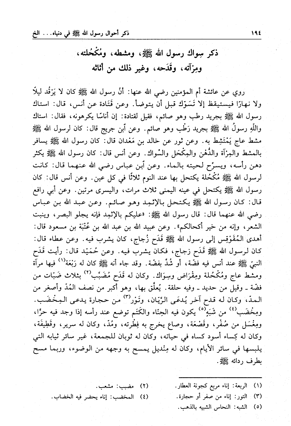 ذكر سواك رسول الله ( صلى الله عليه وسلم ) ، ومشطه ، ومكحلته ، ومرآته ، وقدحه ، وغير ذلك من أثاثه