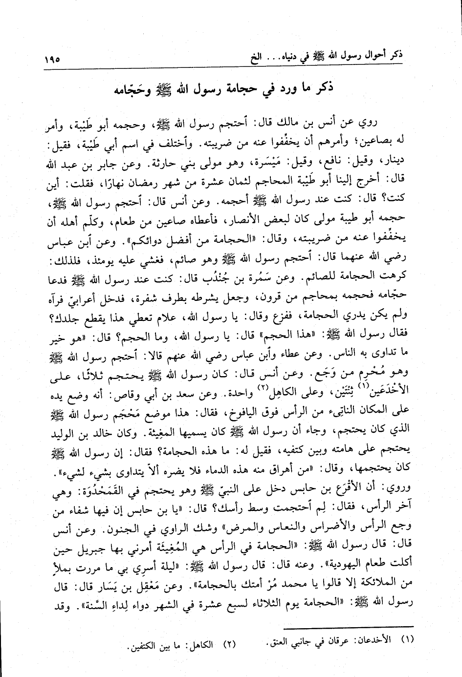 وعن ابن عباس - رضي الله عنهما - قال : احتجم رسول الله ( صلى الله عليه وسلم ) وهو صائم ، فغشى عليه يومئذ ، فلذلك : كرهت الحجامة للصائم ، وعن سمرة بن جندب قال : كنت عند رسول الله ( صلى الله عليه وسلم ) فدعا حجامه فحجمه بمحاجم من قرون ، وجعل يشرطه بطرف شفرة ، فدخل أعرابي فرآه ولم يكن يديري الحجامة ، ففزع وقال : يا رسول الله ، علام تعطى هذا يقطع جلدك ؟ فقال رسول الله ( صلى الله عليه وسلم ) : " هذا الحجم " قال : يا رسول الله ، وما الحجم ؟ قال : " هو خير ما تداوي به الناس " . وعن عطاء ابن عباس - رضي الله عنهما - قالا : احتجم رسول الله ( صلى الله عليه وسلم ) وهو محرم من وجع . وعن أنس قال : كان رسول الله ( صلى الله عليه وسلم ) يحتجم ثلاثا ، على الأخدعين ثنتين ، وعلى الكاهل واحدة . وعن سعد بن أبي وقاص : أنه وضع يده على المكان الناتئ من الرأس فوق اليافوخ ، فقال : هذا موضع محجم رسول الله ( صلى الله عليه وسلم ) الذي كان يحتجم ، وجاء أن رسول الله ( صلى الله عليه وسلم ) كان يسميها المغيثة . وكان خالد بن الوليد يحتجم على هامته وبين كتفيه ، فقيل له : ما هذه الحجامة ؟ فقال : إن رسول الله ( صلى الله عليه وسلم ) كان يحتجمها ، وقال : " من أهراق منه هذه الدماء فلا يضره ألا يتداوى بشيء لشيء " . ورورى : أن الأقرع بن حابس دخل على النبي ( صلى الله عليه وسلم ) وهو يحتجم في القمحدوة : وهي آخر الرأس ، فقال : لم احتجمت وسط رأسك ؟ قال : " يا ابن حابس إن فيها شفاء ومن وجع الرأس والأضراس والنعاس والمرض " وشك الراوي في الجنون . وعن أنس قال قال رسول الله ( صلى الله عليه وسلم ) : " الحجامة في الرأس هي المغيثة أمرني بها جبريل حين أكلت طعام اليهودية " . وعنه قال قال رسول الله ( صلى الله عليه وسلم ) : " ليلة أسرى بي ما مررت بملأ من الملائكة إلا قالوا يا محمد مر أمتك بالحجامة " . وعن معقل بن يسار قال قال رسول الله ( صلى الله عليه وسلم ) : " الحجامة يوم الثلاثاء لسبع عشرة في الشهر دواء لداء السنة " . وقد
