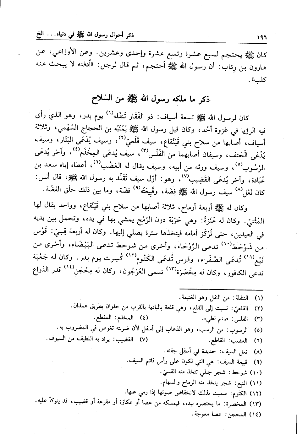 كان لرسول الله ( صلى الله عليه وسلم ) تسعة أسياف : ذو الفقار تنفله يوم بدر ، وهو الذي رأى فيه الرؤيا في غزوة أحد ، وكان قبل رسول الله ( صلى الله عليه وسلم ) لمنبه بن الحجاج السهمي ، وثلاثة أسياف ، أصابها من سلاح بني قينقاع ، سيف قلعي ، وسيف يدعى البتار ، وسيف يدعى الحتف ، وسيفان أصابهما من الفلس ، سيف يدعى المخذم ، وآخر يدعى الرسوب ، وسيف ورثه عن أبيه ، وسيف يقال له العضب ، أعطاه إياه سعد بن عبادة ، وآخر يدعى القضيب ، وهو أول سيف تقلد به رسول الله ( صلى الله عليه وسلم ) ، قال أنس : كان نعل سيف رسول الله ( صلى الله عليه وسلم ) فضة ، وقبيعته فضة ، وما بين ذلك حلق الفضة .