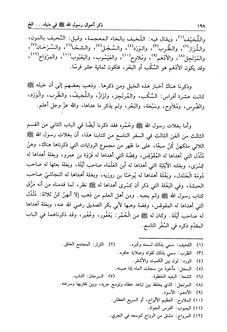 واللحيف ، ويقال فيه : اللخيف بالخاء المعجمة ، وقيل : النحيف بالنون ، واللّزاز ، والظّرب ، والورد ، والسجل ، والشحا ، والسرحان ، والمرتجل ، والأدهم ، وملاوح ، والعيسوب ، واليعبوب ، والمرواح ، وقد يكون الأدهم هو السكب أو البحر ، فتكون ثمانية عشر فرسا . وذكرنا هناك أخبار هذه الخيل ومن ذكرها . وذهب بعضهم إلى خيله ( صلى الله عليه وسلم ) كانت عشرة أفراس : السكب ، والمرتجز ، ولزاز ، واللخيف ، والظرب ، والورد ، والضرس ، وملاوح ، وسبحة ، والبحر ، ولم يذكر ما عداها والله عز وجل أعلم .