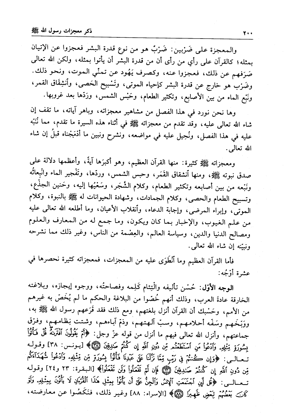فأما القرآن العظيم وما انطوى عليه من المعجزات ، فمعجزاته كثيرة نحصرها في عشرة أوجه : الوجه الأول - حسن تأليفه والتئام كلمه وفصاحته ، ووجوه إيجازه ، وبلاغته الخارقة عادة العرب ، وذلك أنهم خصوا من البلاغة والحكم ما لم يخص به غيرهم من الأمم ، وحسبك أن القرآن أنزل بلغتهم ، ومع ذلك فقد قرعهم رسول الله ( صلى الله عليه وسلم ) به ، ووبخهم وسفه أحلامهم ، وسب آلهتهم ، وذكم آباءهم ، وشتت نظامهم ، وفرق جماعتهم ، وأنزل الله تعالى فيهم ما أنزل من قوله عز وجل : " أم يقولون افتراه قل فأتوا بسورةٍ مثله وادعوا من استطعتم من دون الله إن كنتم صادقين " وقوله تعالى : " وإن كنتم في ريبٍ مما نزلنا على عبدنا فأتوا بسورةٍ من مثله وادعوا شهداءكم من دون الله إن كنتم صادقين . فإن لم تفعلوا ولن تفعلوا " وقوله تعالى : " قل لئن اجتمعت الإنس والجن على أن يأتوا بمثل هذا القرآن لا يأتون بمثله ولو كان بعضهم لبعضٍ ظهيراً " وغير ذلك ، فنكصوا عن معارضته ،