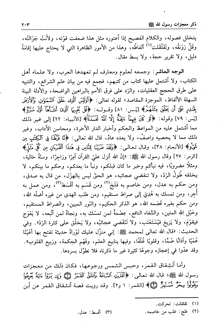 الوجه العاشر - وجمعه لعلوم ومعارف لم تعهدها العرب ، ولا علماء أهل الكتاب ، ولا اشتمل عليها كتاب من كتبهم ، فجمع فيه من بيان علم الشرائع ، والتنبيه على طرق الحجج العقليات ، والرد على فرق الأمم بالبراهين الواضحة ، والأدلة البينة السهلة الألفاظ ، الموجزة المقاصد ، لقوله تعالى : " أو ليس الذي خلق السموات والأرض بقادرٍ على أن يخلق مثلهم " وقوله : " قل يحيها الذي أنشأها أول مرةٍ " وقوله : " لو كان فيهما آلهةٌ إلا الله لفسدتا " إلى غير ذلك مما اشتمل عليه من المواعظ والحكم وأخبار الدار الآخرة ، ومحاسن الآداب ، وغير ذلك مما لا يحصيه واصفٌ ، ولا يعده عادٌ ، قال الله تعالى : " ما فرطنا في الكتاب من شيءٍ " ، وقال تعالى : " ولقد ضربنا للناس في هذا القرآن من كل مثلٍ " وقال رسول الله ( صلى الله عليه وسلم ) : " إن الله أنزل على القرآن آمراً وزاجراً ، وسنةً خالية ، ومثلا مضروبا ، فيه نبأكم وخبرما كان قبلكم ، ونبأ ما بعدكم ، وحكم ما بينكم ، لا يخلقه طول الرد ، ولا تنقضي عجائبه ، هو الحق ليس بالهزل ، من قال به صدق ، ومن حكم به عدل ، ومن خاصم به فلج ، ومن قسم به أقسط ، ومن عمل به أجر ، ومن تمسك به هدي إلى صراط مستقيم ، ومن طلب الهدى من غيره أضله الله ، ومن حكم بغيره قصمه الله ، هو الذكر الحكيم ، والنور المبين ، والصراط المستقيم ، وحبل الله المتين ، والشفاء النافع ، عصمةٌ لمن تمسك به ، ونجاةٌ لمن اتبعه ، لا يعوج فيقوم ، ولا يزيغ فيستعتب ، ولا تنقضي عجائبه ، ولا يخلق على كثرة الرد " . وفي الحديث : " قال الله تعالى لمحمد - ( صلى الله عليه وسلم ) - إني منزلٍ عليك توراةً حديثة تفتح بها أعينا عمياً وآذانا صماً ، وقلوباً غلفا ، وفيها ينابيع العلم ، وفهم الحكمة ، وربيع القلوب " . وقد عدوا في إعجازه وجوها كثيرة غير ما ذكرناه فلا نطول بسردها .
