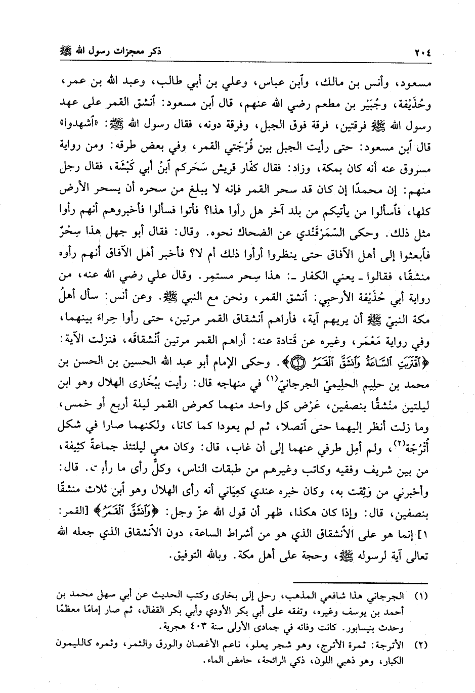 وحكى الإمام أبو عبد الله الحسين بن الحسن بن محمد بن حليم الحليمي الجرجاني في منهاجه قال : رأيت ببخارى الهلال وهو ابن ليلتين منشقاً بنصفين ، عرض كل واحد منهما كعرض القمر ليلة أربع أو خمس ، وما زلت أنظر إليهما حتى اتصلا ، ثم لم يعودا كما كانا ، ولكنهما صارا في شكل أترجة ، ولم أمل طرفي عنهما إلى أن غاب ، قال : وكان معي ليلتئذ جماعةٌ كثيفة ، من بين شريف وفقيه وكاتب وغيرهم من طبقات الناس ، وكلٌ رأى ما رأيت . قال : وأخبرني من وثقت به ، وكان خبره عندي كعياني أنه رأى الهلال وهو ابن ثلاث منشقاً بنصفين ، قال : وإذا كان هكذا ، ظهر أن قول الله عز وجل : " وانشق القمر " إنما هو على الانشقاق الذي هو من أشراط الساعة ، دون الانشقاق الذي جعله الله تعالى آية لرسوله ( صلى الله عليه وسلم ) وحجة على أهل مكة . وبالله التوفيق .