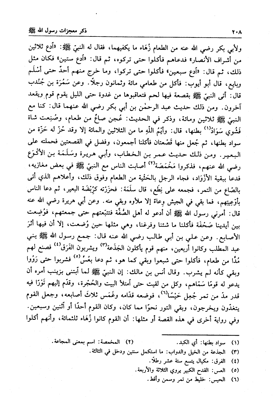 وعن أبي هريرة رضي الله عنه قال : أمرني رسول الله ( صلى الله عليه وسلم ) أن أدعو له أهل الصفة فتتبعتهم حتى جمعتهم ، فوضعت بين أيدينا صحفة فأكلنا ما شئنا وفرغنا ، وهي مثلها حين وضعت ، إلا أن فيها أثر الأصابع . وعن علي بن أبي طالب رضي الله عنه قال : جمع رسول الله ( صلى الله عليه وسلم ) بني عبد المطلب وكانوا أربعين ، منهم قوم يأكلون الجذعة ويشربون الفرق فصنع لهم مدا من طعام ، فأكلوا حتى شبعوا وبقى كما هو ، ثم دعا بعس فشربوا حتى رووا وبقى كأنه لم يشرب . وقال أنس ابن مالك : إن النبي ( صلى الله عليه وسلم ) لما ابتنى بزينب أمره أن يدعو له قوما سماهم ، وكل من لقيت حتى امتلأ البيت والحجرة ، وقدم إليهم تورا فيه قدر مد من تمر جعل حيسا ، فوضعه قدامه وغنمس ثلاثة أصابعه ، وجعل القوم يتغدون ويخرجون ، وبقي النور نحوا ما كان ، وكان القوم أحدا أو اثنين وسبعين . وفي رواية أخرى في هذه القصة أو مثلها : أن القوم كانوا زهاء ثلثمائة ، وأنهم أكلوا