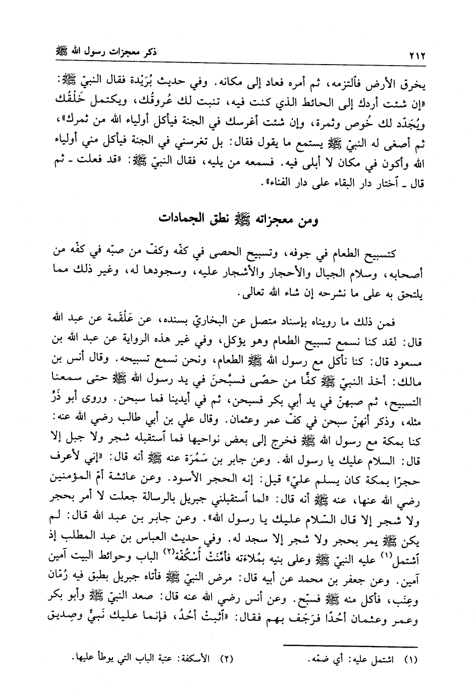 كتسبيح الطعام في جوفه ، وتسبيح الحصى في كفه وكف من صبه في كفه من أصحابه ، وسلام الجبال والأحجار والأشجار عليه ، وسجودها له ، وغير ذلك مما يلتحق به على ما نشرحه إن شاء الله تعالى . فمن ذلك ما رويناه بإسناد متصل عن البخاري بسنده ، عن علقمة عن عبد الله قال : لقد كنا نسمع تسبيح الطعام وهو يؤكل ، وفي غير هذه الرواية عن عبد الله بن مسعود قال : كنا نأكل مع رسول الله ( صلى الله عليه وسلم ) الطعام ، ونحن نسمع تسبيحه . وقال أنس بن مالك : أخذ النبي ( صلى الله عليه وسلم ) كفاٌ من حصًى فسبحن في يد رسول الله ( صلى الله عليه وسلم ) حتى سمعنا التسبيح ، ثم صبهن في يد أبي بكر فسبحن ، ثم في أيدينا فما سبحن . وروى أبو ذر مثله ، وذكر أنهن سبحن في كف عمر وعثمان . وقال علي بن أبي طالب رضي الله عنه : كنا بمكة مع رسول الله ( صلى الله عليه وسلم ) فخرج إلى بعض نواحيها فما استقبله شجر ولا جبل إلا قال : السلام عليك يا رسول الله .