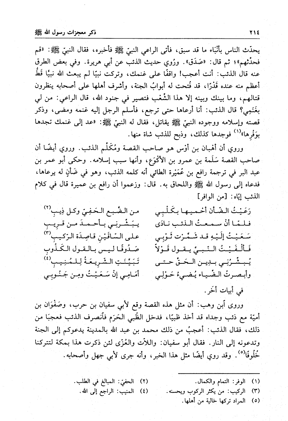 يحدث الناس بأنباء ما قد سبق ، فأتى الراعي النبي ( صلى الله عليه وسلم ) فأخبره ، فقال النبي ( صلى الله عليه وسلم ) : " قم فحدثهم " ، ثم قال : " صدق " . وروى حديث الذئب عن أبي هريرة . وفي بعض الطرق عنه قال الذئب : أنت أعجب واقفا على غنمك ، وتركت نبيا لم يبعث الله نبيا قط أعظم منه عنده قدراً ، قد فتحت له أبواب الجنة ، وأشرف أهلها على أصحابه ينتظرون قتالهم ، وما بينك وبينه إلا هذا الشعب فتصير في جنود الله ، قال الراعي : من لي بغنمي ؟ قال الذئب : أنا أرعاها حتى ترجع ، فأسلم الرجل إليه غنمه ومضى ، وذكر قصته واسلامه ووجوده النبي ( صلى الله عليه وسلم ) يقاتل ، فقال له النبي ( صلى الله عليه وسلم ) : " عد إلى غنمك تجدها بوفرها " فوجدها كذلك ، وذبح للذئب شاة منها .