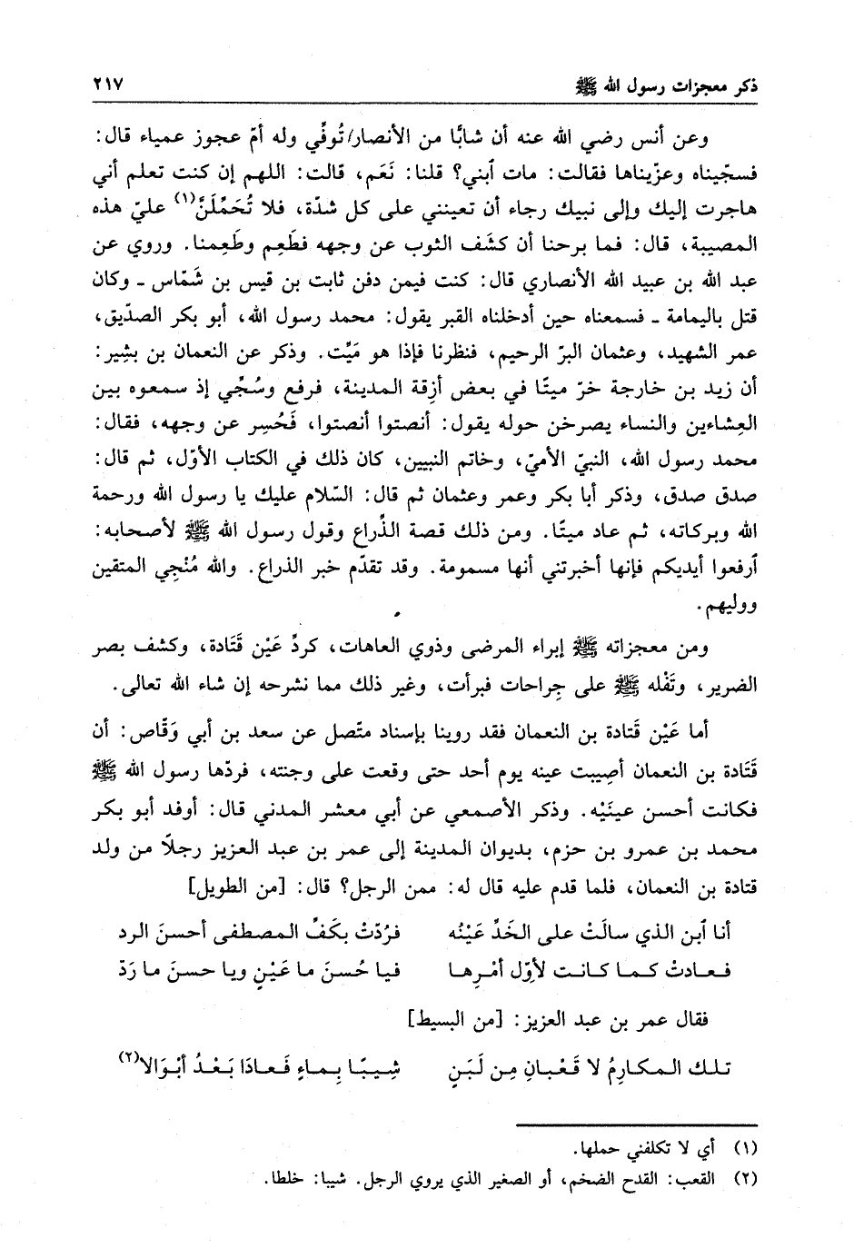 وعن أنس رضي الله عنه أن شابا من الأنصار توفي وله أم عجوز عمياء قال : فسجيناه وعزيناها فقالت : مات ابني ؟ قلنا : نعم ، قالت : اللهم إن كنت تعلم أني هاجرت إليك وإلى نبيك رجاء أن تعينني على كل شدة ، فلا تحملن على هذه المصيبة ، قال : فما برحنا أن كشف الثوب عن وجهه فطعم وطعمنا . وروى عن عبد الله بن عبيد الله الأنصاري قال : كنت فيمن دفن ثابت بن قيس ابن شماس - وكان قتل باليمامة - فسمعناه حين أدخلناه القبر يقول : محمد رسول الله ، أبو بكر الصديق ، عمر الشهيد ، وعثمان البر الرحيم ، فنظرنا فإذا هو ميت . وذكر عن النعمان بن بشير : أن زيد بن خارجة خر ميتا في بعض أزقة المدينة ، فرفع وسجى إذ سمعوه بين العشاءين والنساء يصرخن حوله يقول : أنصتوا ، أنصتوا ، فحسر عن وجهه ، قفال : محمد رسول الله ، النبي الأمي ، وخاتم النبيين ، كان ذلك في الكتاب الأول ، ثم قال : صدق صدق ، وذكر أبا بكر وعمر وعثمان ثم قال : السلام عليك يا رسول الله ورحمة الله وبركاته ، ثم عاد ميتا . ومن ذلك قصة الذراع وقول رسول الله ( صلى الله عليه وسلم ) لأصحابه : ارفعوا أيديكم فإنها أخبرتني أنها مسمومة . قد تقدم خبر الذراع . والله منجي المتقين ووليهم .
