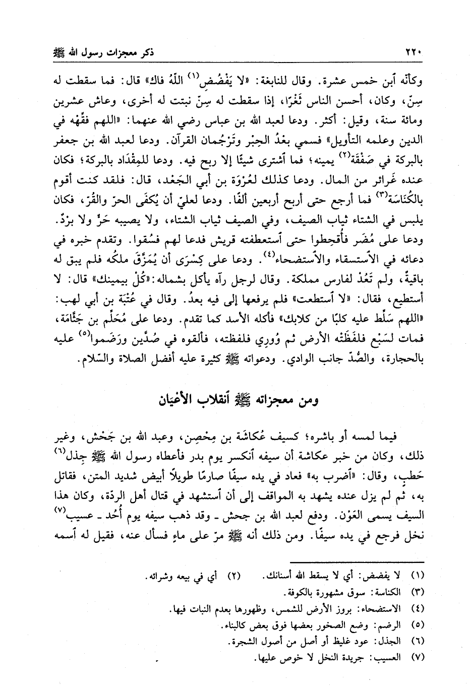 فيما لمسه أو باشره ؛ كسيف عكاشة بن محصن ، وعبد الله بن جحش ، وغير ذلك ، وكان من خبر عكاشة أن سفيه انكسر يوم بدر فأعطاه رسول الله ( صلى الله عليه وسلم ) جذل حطبٍ ، وقال : " اضرب به " فعاد في يده سيفاً صارماً طويلاً أبيض شديد المتن ، فقاتل به ، ثم لم يزل عنده يشهد به المواقف إلى أن استشهد في قتال أهل الردة ، وكان هذا السيف يسمى العون . ودفع لعبد الله بن جحش - وقد ذهب سفيه يوم أحد - عسيب نخل فرجع في يده سيفاً . ومن ذلك أنه ( صلى الله عليه وسلم ) مر على ماء فسأل عنه ، فقيل له اسمه