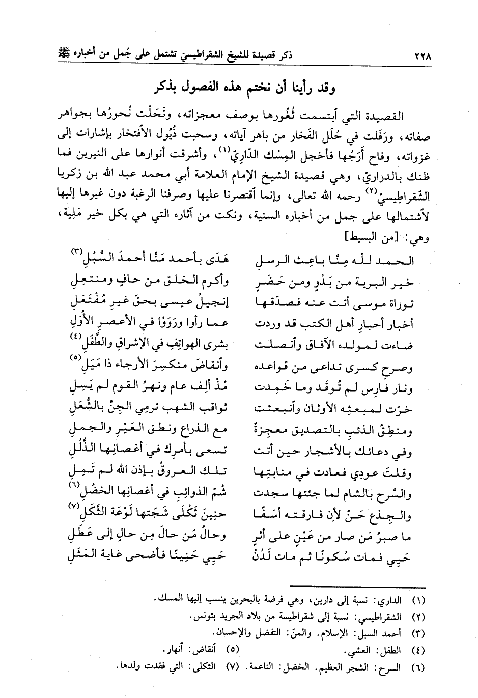 القصيدة التي ايتسمت ثغورها بوصف معجزاته ، وتحلت نحورها بجواهر صفاته ، ورفلت في حلل الفخار من باهر آياته ، وسحبت ذيول الافتخار بإشارات إلى غزواته ، وفاح أرجها فأخجل المسك الدّاريّ ، وأشرقت أنوارها على النيرين فما ظنك بالدراري ، وهي قصيدة الشيخ الإمام العلامة أبي محمد عبد الله بن زكريا الشقراطيسي رحمه الله تعالى ، وإنما اقتصرنا عليها وصرفنا الرغبة دون غيرها إليها لاشتمالها على جمل من أخباره السنية ، ونكت من آثاره التي هي بكل خير ملية ، وهي :
