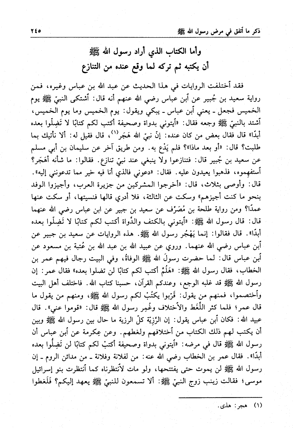 فقد اختلفت الروايات في هذا الحديث عن عبد الله بن عباس وغيره ، فمن رواية سعيد بن جبير عن ابن عباس رضي الله عنهم أنه قال : اشتكى النبي ( صلى الله عليه وسلم ) يوم الخميس فجعل - يعني ابن عباس - يبكي ويقول : يوم الخميس وما يوم الخميس ، اشتد بالنبي ( صلى الله عليه وسلم ) وجعه فقال : " ايتوني بدواة وصحيفة أكتب لكم كتابا لا تضلوا بعده أبداً " قال فقال بعض من كان عنده : إن نبي الله هجر ، قال فقيل له : ألا نأتيك بما طلبت ؟ قال : " أو بعد ماذا " ؟ فلم يدع به . ومن طريق آخر عن سليمان بن أبي مسلم عن سعيد بن جبير قال : فتنازعوا ولا ينبغي عند نبي تنازع . فقالوا : ما شأنه أهجر ؟ استفهموه ، فذهبوا يعيدون عليه . فقال : " دعوني فالذي أنا فيه خير مما تدعونني إليه " . قال : وأوصى بثلاث ، قال : " أخرجوا المشركين من جزيرة العرب ، وأجيزوا الوفد بنحو ما كنت أجيزهم " وسكت عن الثالثة ، فلا أدري قالها فنسيتها ، أو سكت عنها عمداً ؟ . ومن رواية طلحة بن مصرف عن سعيد بن جبير عن ابن عباس رضي الله عنهما قال قال رسول الله ( صلى الله عليه وسلم ) : " ايتوني بالكتف والدواة أكتب لكم كتابا لا تضلوا بعده أبدا " . قال فقالوا : إنما يهجر رسول الله ( صلى الله عليه وسلم ) . هذه الروايات عن سعيد بن جبير عن ابن عباس رضي الله عنهما . وروى عن عبيد الله بن عبد الله بن عتبة بن مسعود عن ابن عباس قال : لما حضرت رسول الله ( صلى الله عليه وسلم ) الوفاة ، وفي البيت رجال فيهم عمر بن الخطاب ، فقال رسول الله ( صلى الله عليه وسلم ) : " هلم أكتب لكم كتابا لن تضلوا بعده " فقال عمر : إن رسول الله ( صلى الله عليه وسلم ) قد غلبه الوجع ، وعندكم القرآن ، حسبنا كتاب الله . فاختلف أهل البيت واختصموا ، فمنهم من يقول : قربوا يكتب لكم رسول الله ( صلى الله عليه وسلم ) ، ومنهم من يقول ما قال عمر ، فلما كثر اللغلط والاختلاف وغمر رسول الله ( صلى الله عليه وسلم ) قال : " قوموا عني " . قال عبيد الله : فكان ابن عباس يقول : إن الرزية كل الرزية ما حال بين رسول الله ( صلى الله عليه وسلم ) وبين أن يكتب لهم ذلك الكتاب من اختلافهم ولغطهم . وعن عكرمة عن ابن عباس أن رسول الله ( صلى الله عليه وسلم ) قال في مرضه : " ايتوني بدواة وصحيفة أكتب لكم كتاباً لن تضلوا بعده أبداً " . فقال عمر بن الخطاب رضي الله عنه : من لفلانة وفلانة - من مدائن الروم - إن رسول الله ( صلى الله عليه وسلم ) لن يموت حتى يفتتحها ، ولو مات لانتظرناه ، كما انتظرت بنو إسرائيل موسى ؛ فقالت زينب زوج النبي ( صلى الله عليه وسلم ) : ألا تسمعون للنبي ( صلى الله عليه وسلم ) يعهد إليكم ؟ فلغطوا
