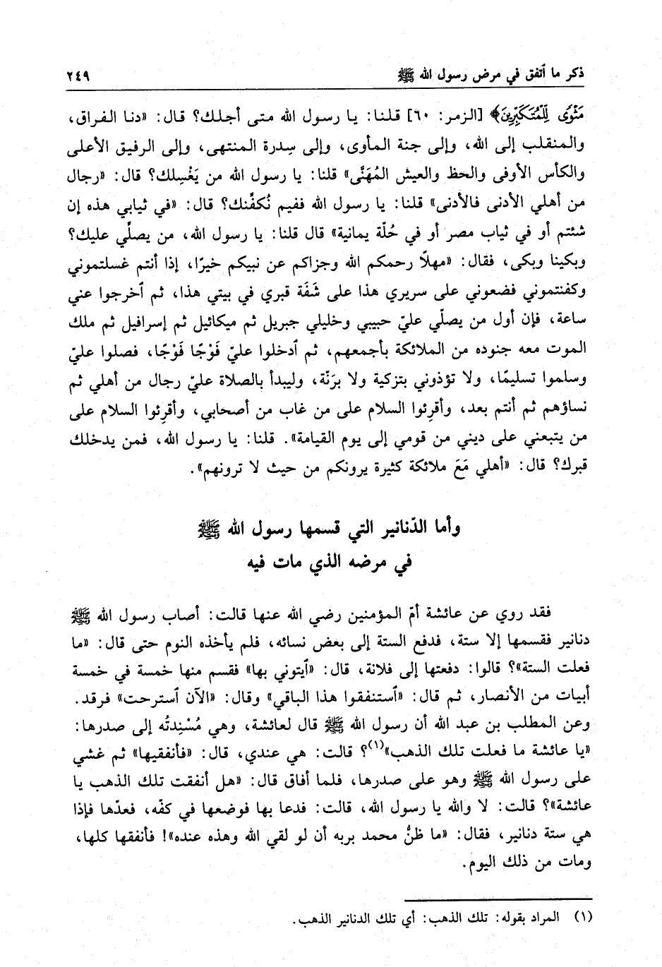 فقد روى عن عائشة أم المؤمنين رضي الله عنها قالت : أصاب رسول الله ( صلى الله عليه وسلم ) دنانير فقسمها إلا ستة ، فدفع الستة إلى بعض نسائه ، فلم يأخذه النوم حتى قال : " ما فعلت الستة " ؟ قالوا : دفعتها إلى فلانة ، قال : " ايتوني بها " ، فقسم منها خمسة في خمسة أبيات من الأنصار ، ثم قال : " استنفقوا هذا الباقي " وقال : " الآن استرحت " فرقد . وعن المطلب بن عبد الله أن رسول الله ( صلى الله عليه وسلم ) قال لعائشة ، وهي مسندته إلى صدرها : " يا عائشة ما فعلت تلك الذهب " ؟ قالت : هي عندي ، قال : " فأنفقيها " ثم غشى على رسول الله ( صلى الله عليه وسلم ) وهو على صدرها ، فلما أفاق قال : " هل أنفقت تلك الذهب يا عائشة " ؟ قالت : لا والله يا رسول الله ، قالت : فدعا بها فوضعها في كفه ، فعدها فإذا هي ستة دنانير ، فقال : " ما ظن محمد بربه أن لو لقى الله وهذه عنده " فأنفقها كلها ، ومات من ذلك اليوم .
