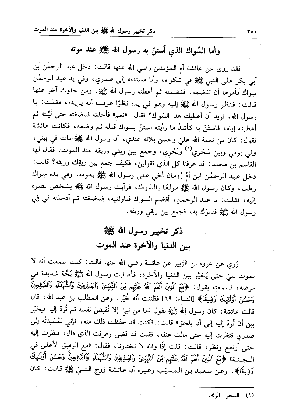 روى عن عروة بن الزبير عن عائشة رضي الله عنها قالت : كنت سمعت أنه لا يموت نبي حتى يخير بين الدنيا والآخرة ، فأصابت رسول الله ( صلى الله عليه وسلم ) بحة شديدة في مرضه ، فسمعته يقول : " مع الذين أنعم الله عليهم من النبيين والصديقين والشهداء والصالحين وحسن أولئك رفيقاً " فظننت أنه خير . وعن عبد المطلب بن عبد الله ، قال قالت عائشة : كان رسول الله ( صلى الله عليه وسلم ) يقول : " ما من نبي إلا تقبض نفسه ثم ترد إليه فيخير بين أن ترد إليه إلى أن يلحق " قالت : " فكنت قد حفظت ذلك منه ، فإني لمسندته إلى صدري فنظرت إليه حتى مالت عنقه ، فقلت قد قضى وعرفت الذي قال ، فنظرت إليه حتى ارتفع ونظر ، قالت : قلت إذاً والله لا تختارنا ، فقال : " مع الرفيق الأعلى في الجنة " " مع الذين أنعم الله عليهم من النبيين والصديقين والشهداء والصالحين وحسن أولئك رفيقا " . وعن سعيد بن أبي المسيب وغيره أن عائشة زوج النبي ( صلى الله عليه وسلم ) قالت : كان