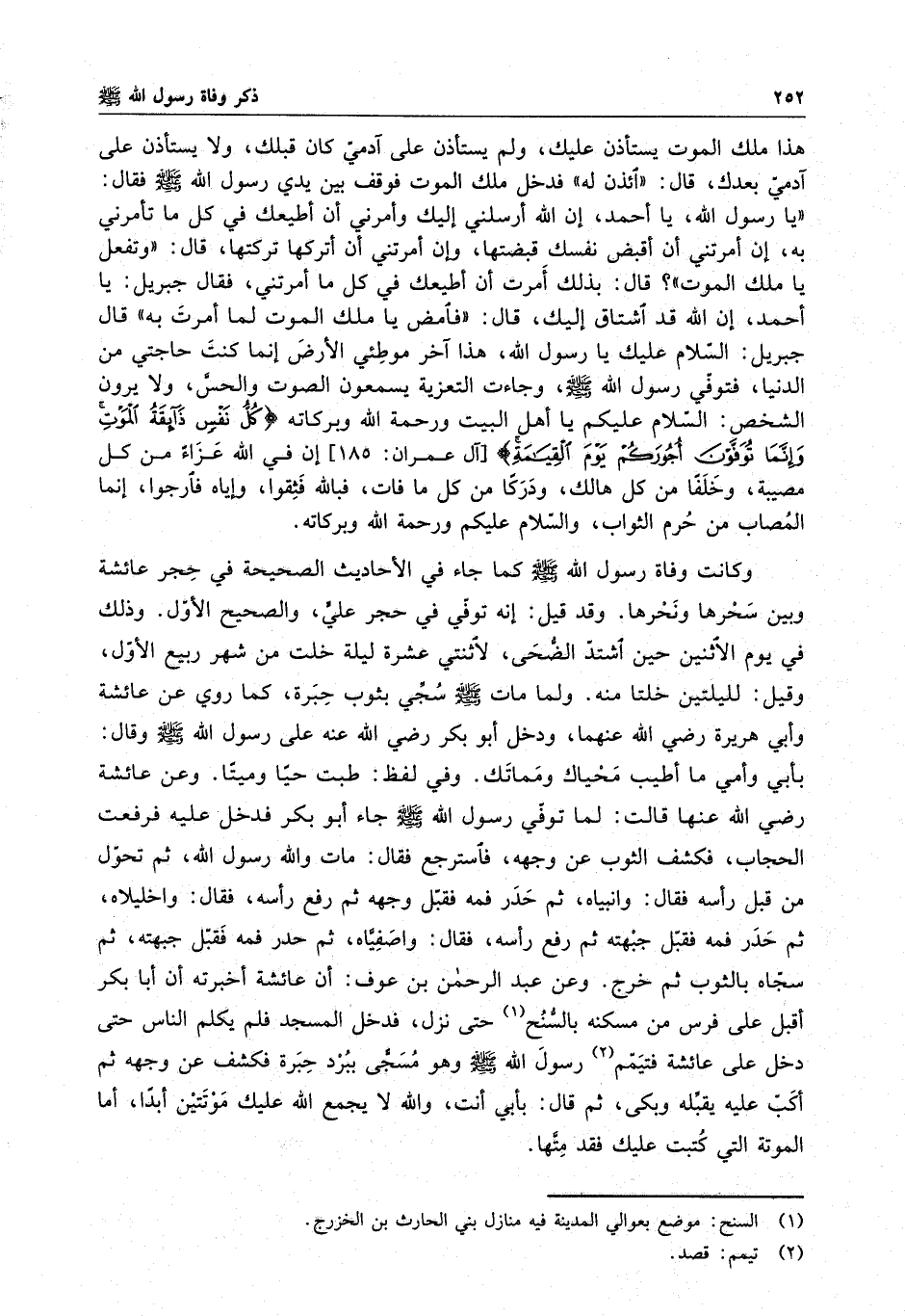 وكانت وفاة رسول الله ( صلى الله عليه وسلم ) كما جاء في الأحاديث الصحيحة في حجر عائشة وبين سحرها ونحرها . وقد قيل : إنه توفي في حجر علي ، والصحيح الأول . وذلك في يوم الاثنين حين اشتد الضحى ، لاثنتي عشرة ليلة خلت من شهر بيع الأول ، وقيل : لليلتين خلتا منه . ولما مات ( صلى الله عليه وسلم ) سجى بثوب حبرة ، كما روى عن عائشة وأبي هريرة رضي الله عنهما ، ودخل أبو بكر رضي الله عنه على رسول الله ( صلى الله عليه وسلم ) وقال : بأبي وأمي ما أطيب محياك ومماتك . وفي لفظ : طبت حيا وميتا . وعن عائشة رضي الله عنها قالت : لما توفي رسول الله ( صلى الله عليه وسلم ) جاء أبو بكر فدخل عليه فرفعت الحجاب ، فكشف الثوب عن وجهه ، فاسترجع فقال : مات والله رسول الله ، ثم تحول من قبل رأسه فقال : وانبياه ، ثم حدر فمه فقبل وجهه ثم رفع رأسه ، فقال : واخيلاه ، ثم حدر فمه فقبل جبهته ثم رفع رأسه ، فقال : واصفياه ، ثم حدر فمه فقبل جبهته ، ثم سجاه بالثوب ثم خرج .