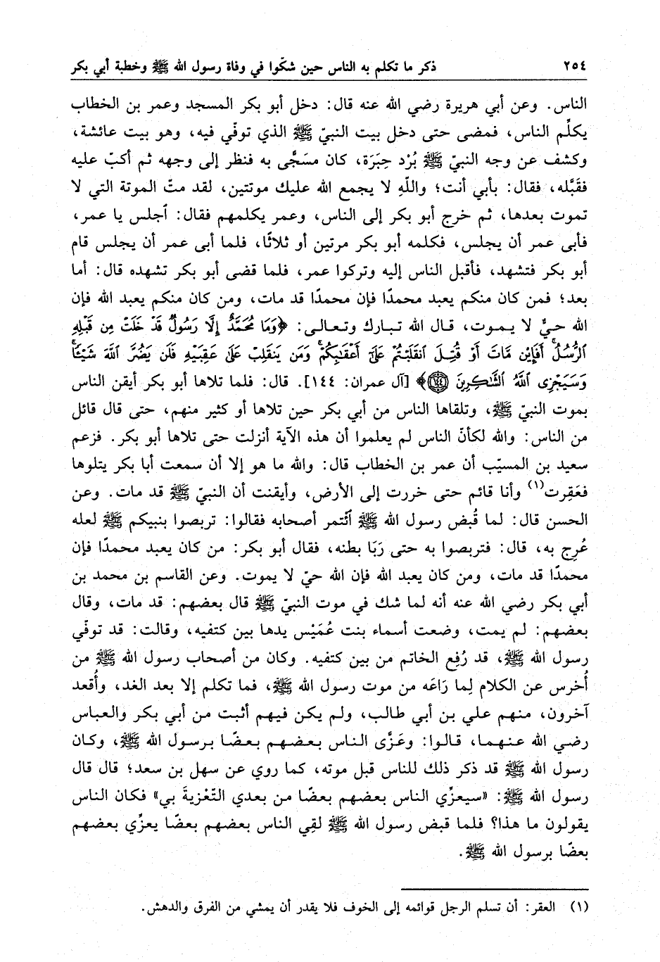 وعن أبي هريرة رضي الله عنه قال : دخل أبو بكر المسجد وعمر بن الخطاب يكلم الناس ، فمضى حتى دخل بيت النبي ( صلى الله عليه وسلم ) الذي توفي فيه ، وهو بيت عائشة ، وكشف عن وجه النبي ( صلى الله عليه وسلم ) برد حبرة ، كان مسجى به فنظر إلى وجهه ثم أكب عليه فقبله ، فقال : بأبي أنت ؛ والله لا يجمع الله عليك موتتين ، لقد مت الموتة التي لا تموت بعدها ، ثم خرج أبو بكر إلى الناس ، وعمر يكلمهم فقال : اجلس يا عمر ، فأبى عمر أن يجلس ، فكلمه أبو بكر مرتين أو ثلاثا ، فلما أبى عمران يجلس قام أبو بكر فتشهد ، فأقبل الناس إليه وتركوا عمرا ، فلما قضى أبو بكر تشهده قال : أما بعد ، فمن كان منكم يعبد محمدا فإن محمدا قد مات ، ومن كان منكم يعبد الله فإن الله حيٌ لا يموت ، قال الله تبارك وتعالى : " وما محمدٌ إلا رسولٌ قد خلت من قبله الرسل أفإن مات أو قتل انقلبتم على أعقابكم ومن ينقلب على عقبيه فلن يضر شيئا وسيجزى الله الشاكرين " .